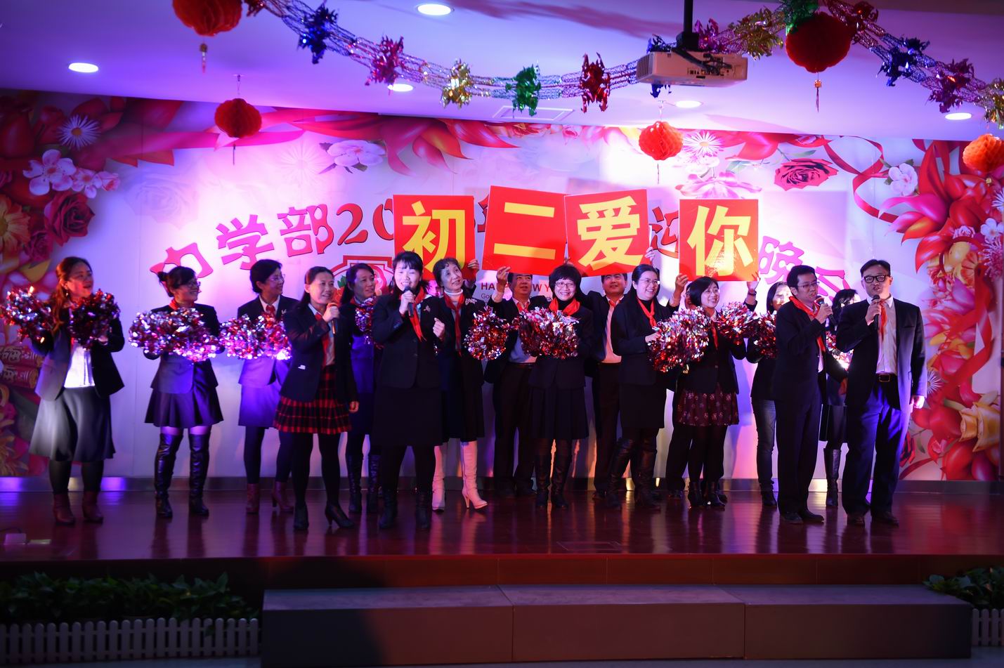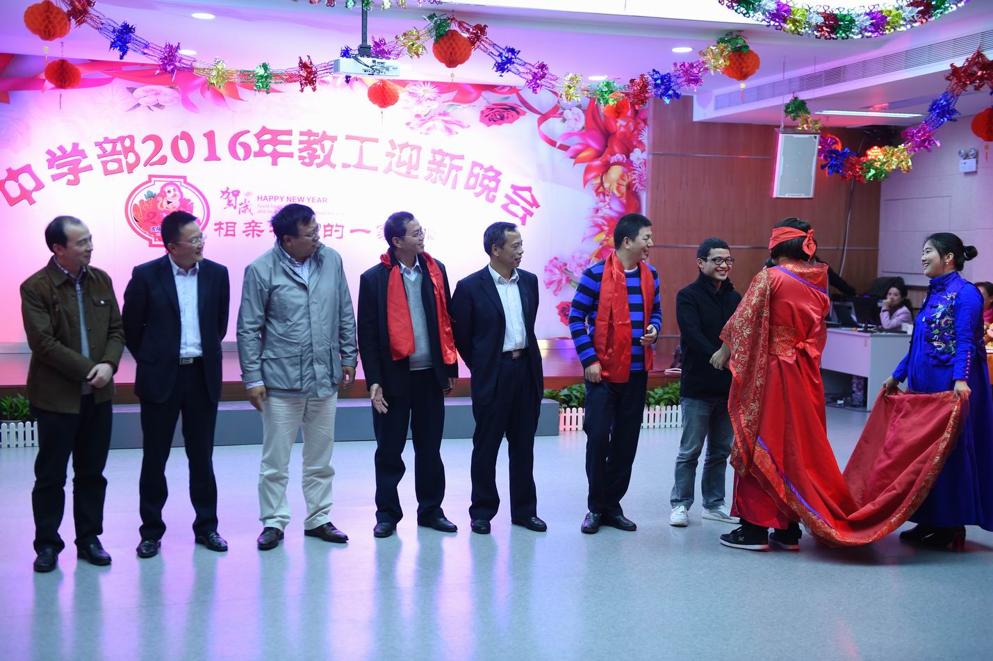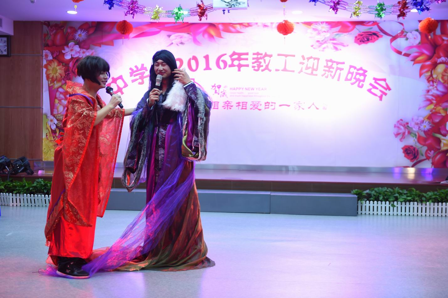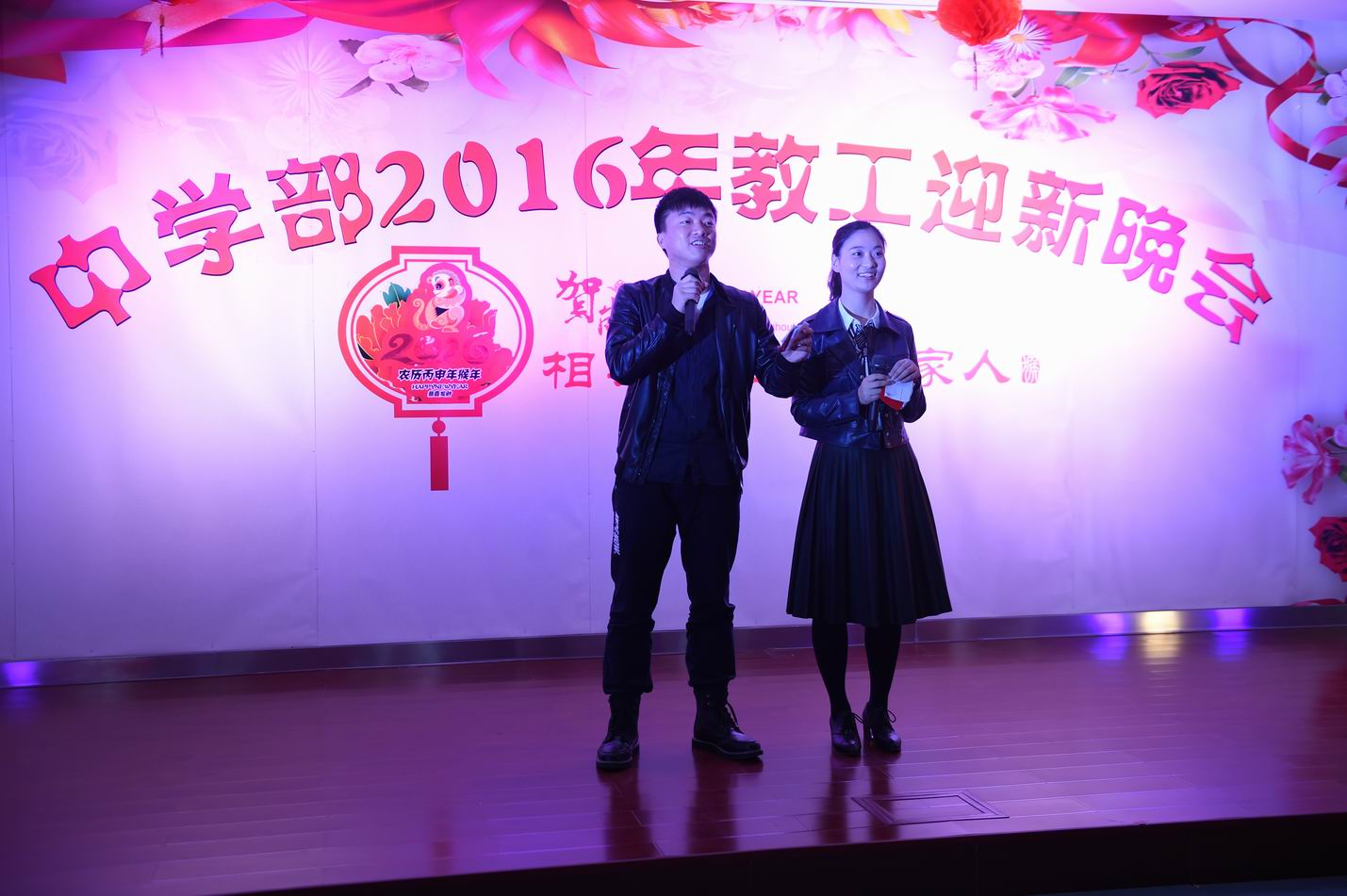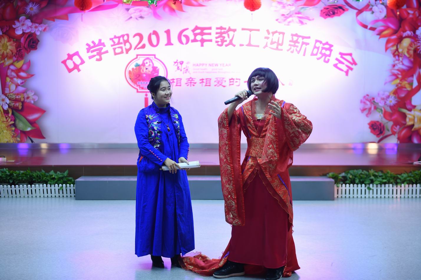随后,教工迎新晚会正式开始,青年教师牛志强和王倩的诙谐主持加上各部门自创的精彩节目,现场气氛热闹。初二年级的《少年中国说》唱出了具有强烈进取精神的中国少年之蓬勃朝气;青年教师韵律十足的《大河之舞》跳出了青春的活力;初三年级滑稽搞笑的《芈月新传》将欢乐的气氛推向高潮;学生处专业到位的合唱《传奇》声部清晰;教务处自编自演的《三句半》道出了实验人的服务尊严;办公室总务处充满年味的二人传《小拜年》喜气洋洋;高三年级彭兰老师的《美丽心情》唱的情深意切;高一年级的情景剧《动物世界》展现了不一样的课堂;高二年级的合唱《半个月亮爬上来》娓娓动听;属相为猴的众猴们在心灵表白之后接受龙校长赠送的传统礼物;初一年级的舞蹈《燃烧吧蔬菜》激情四射。