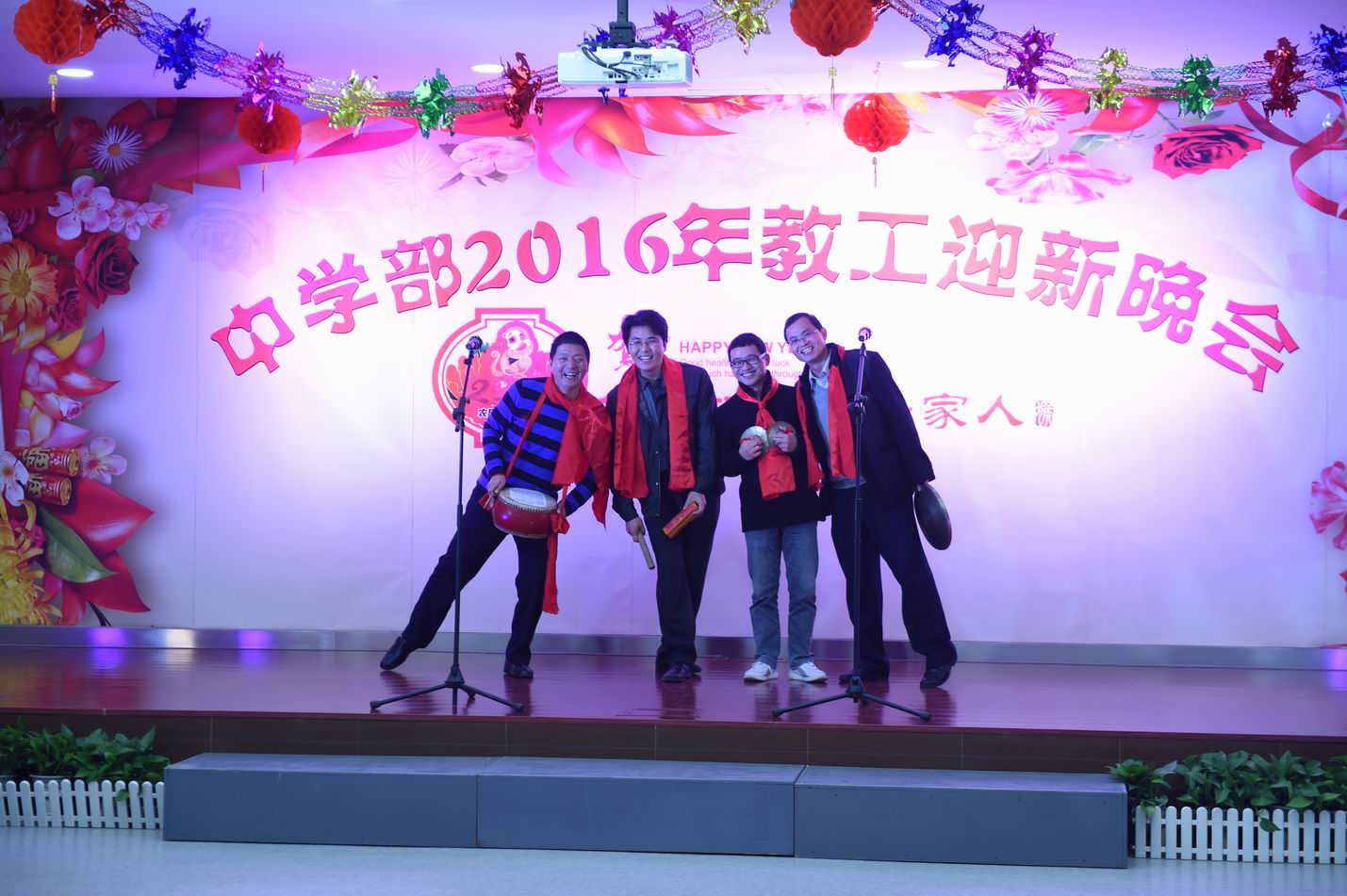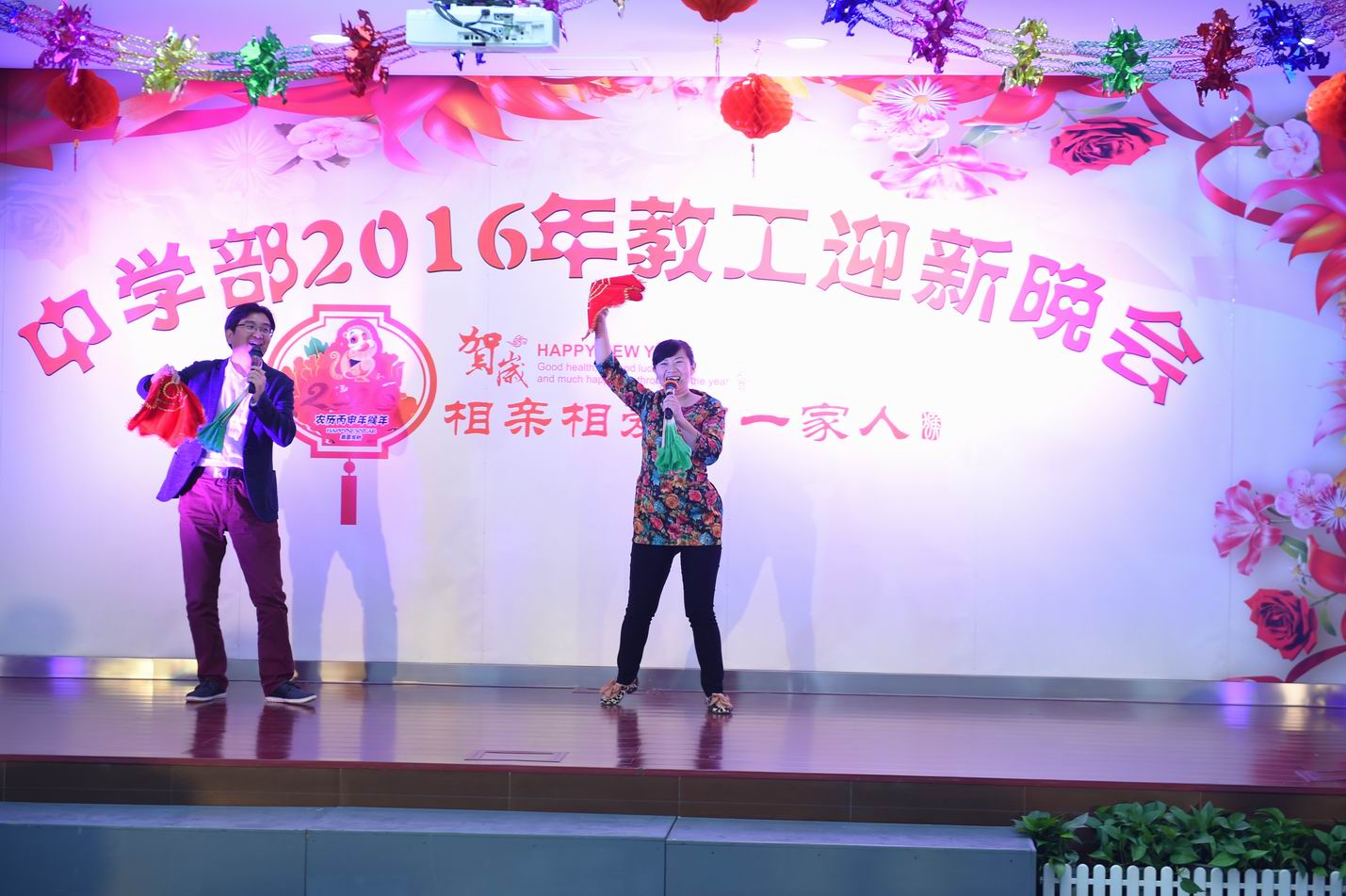 晚上6:30,教工们又来到布置温馨的西楼多功能厅参加迎新晚会。首先,龙校长致新年贺辞,她回顾了过去一年中学部教育教学等方面取得的成绩,充分肯定了2015年教工们的优秀表现,并展望了信心满满的2016年。