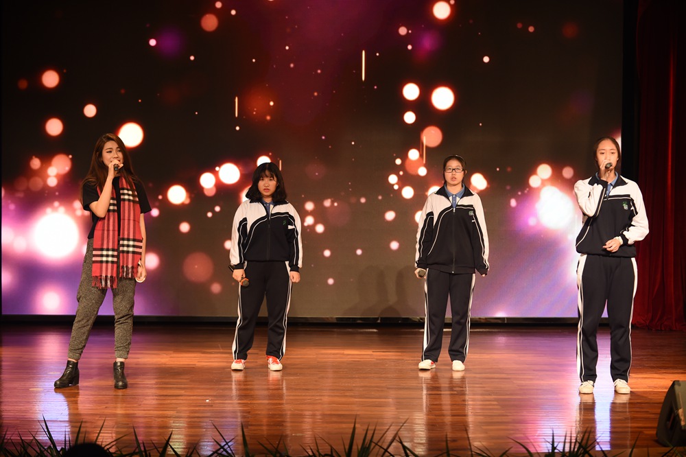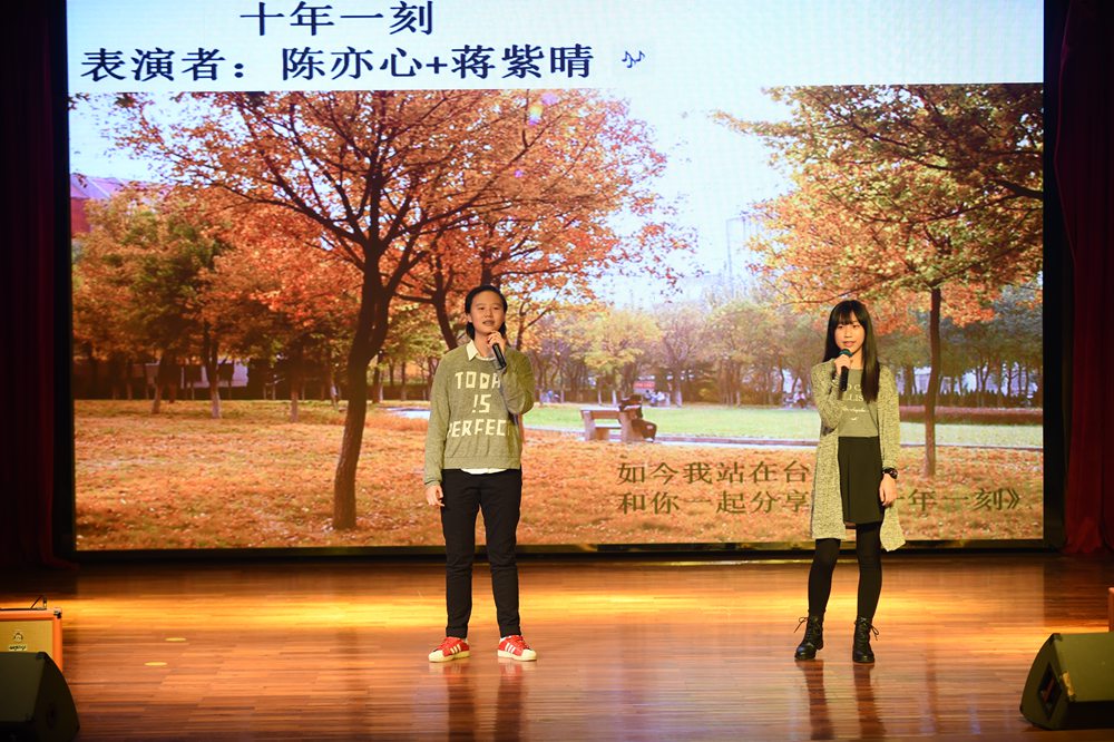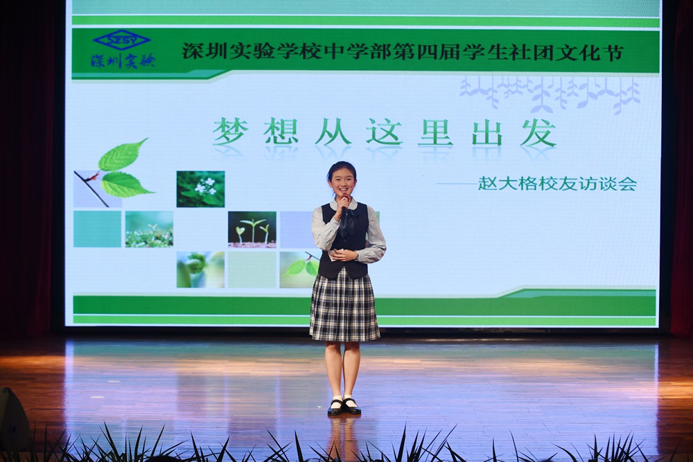 在活动的开场赵大格先为师生们带来了一首动感十足的《All About That Bass》,其独特的嗓音和扎实的唱功获得了在场师生们热烈的掌声。一曲结束,主持人邀请了大格在实验读书时的两位恩师依次上台,分享了她在实验校园生活的点滴。大格自小学就加入了校乐团,而刘忠老师则是当时乐团的老师。他表示大格虽然没有学过专业的声乐,但她在乐团演奏马林巴琴的经历为她现在的节奏感和唱功打下了扎实的基础,而她脚踏实地的做事风格更是造就她如今成功的原因之一。而作为大格当时的班主任的王巍老师也肯定了她沉稳的性格。由此可见,好的人品性格是未来成功的基石。
