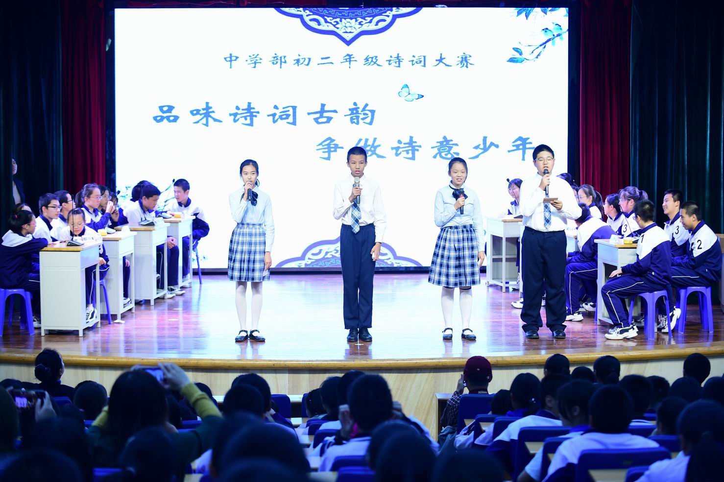 诗词是先人们对经验的总结,同时古典诗词是智慧的源泉,它铸造了中华文化的含蓄内敛;阅读诗词能使学生品味中华文化的精华。2019年12月9日下午,中学部初二年级隆重举行了诗词大赛。本次诗词大赛在初二年级语文组所有老师的精心筹备下,形式丰富且全员参与,充分体现了我校对“阅读立校”的坚守和前行。