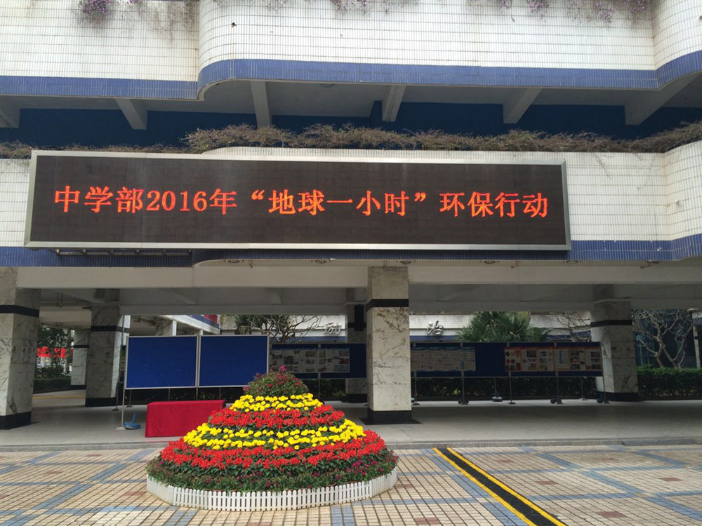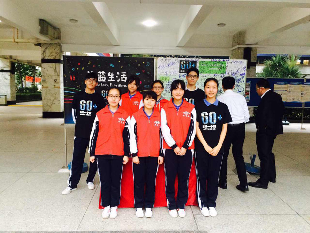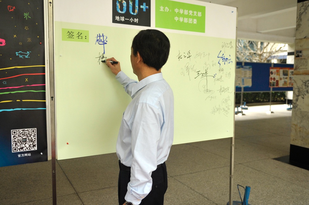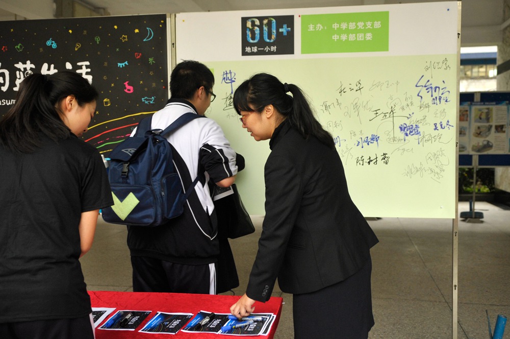 3月18日下午,中学部党支部和团委学生会学生“义心联”在东楼一楼前厅联合举办“2016地球一小时”环保签名活动,共同发起“为蓝生活”的环保倡议,号召全校师生参与一小时,超越1小时,为蓝天做出实际的环保转变。