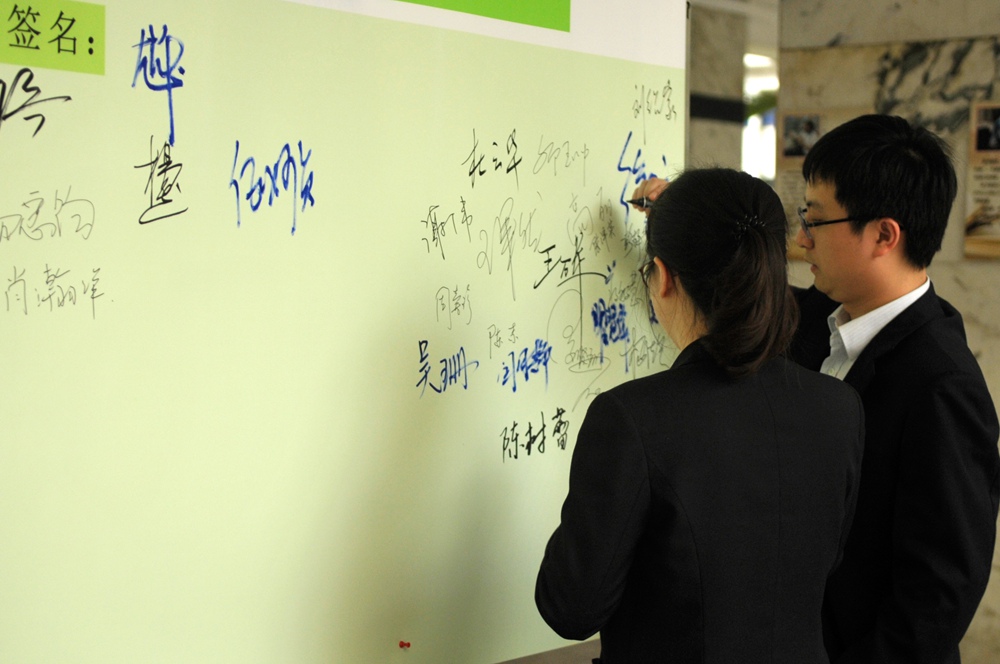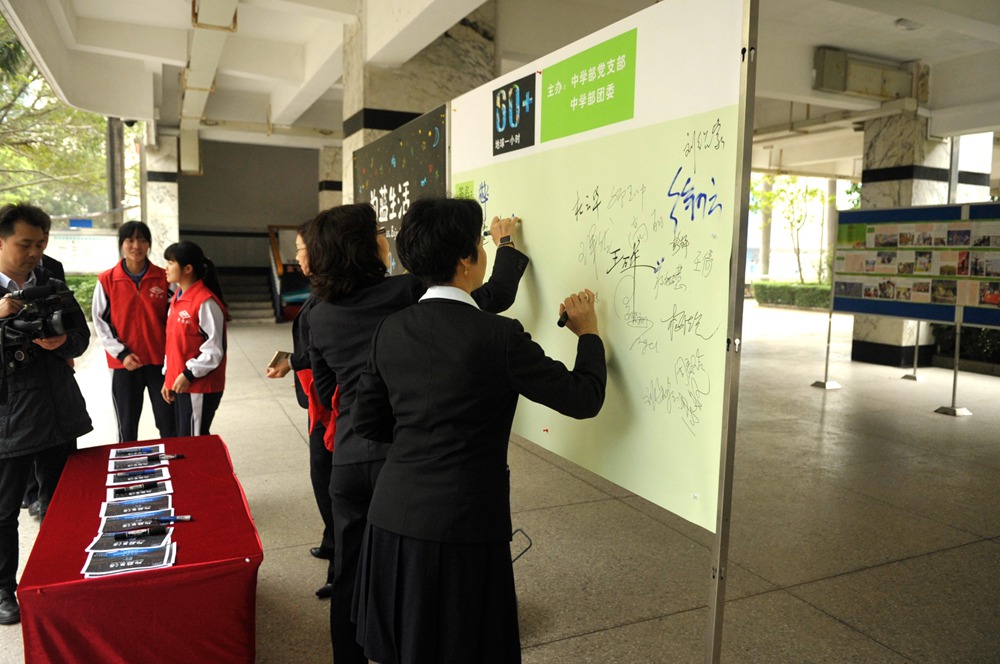 团委学生会学生“义心联”成员身穿义工服,向师生、家长传递着环保理念。中学部党支部龙萍书记带领党员积极参与此次活动,并在签名版上留下自己的姓名和愿望,表达参与维护地球行动的意愿。学生及在场的家长也积极参与,为环保贡献一份力量。现场气氛十分热烈,环保理念在布满签名的板上体现的淋漓尽致,每一个签名都代表着师生、家长对地球-——我们的家园的关心与呵护。