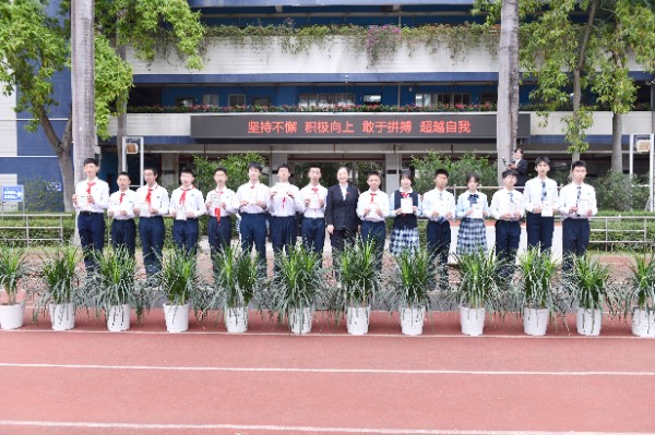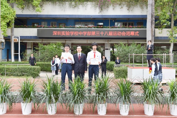 4月10日晨会时间,中学部全体师生齐聚运动场举行第三十八届田径运动会闭幕式,中学部学生处副主任熊珊主持。闭幕式上,冠军代表八年级(4)班杨子澍同学,和大家分享了他的运动感悟。随后,运动会总裁判长李文广老师宣布了竞赛总分成绩及破纪录的运动员成绩;杨宁主任宣布趣味比赛项目、体育风尚奖、优秀学生裁判员、优秀志愿者评比结果。最后,在师生的掌声中,龙校长及中学部行政干部分别为获奖集体、个人颁奖。