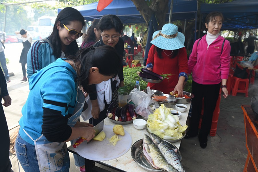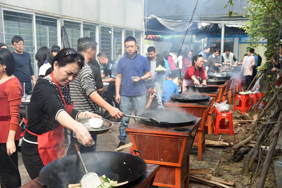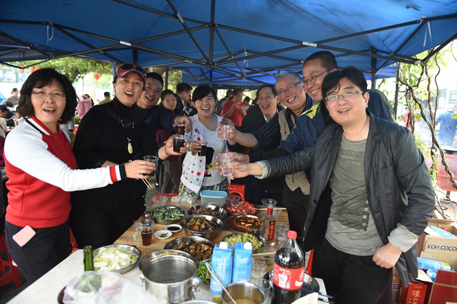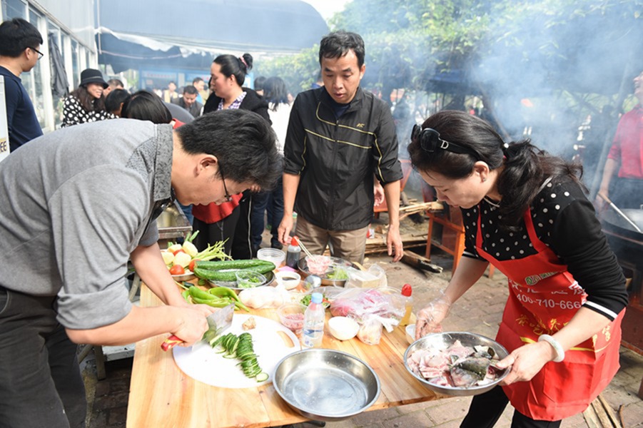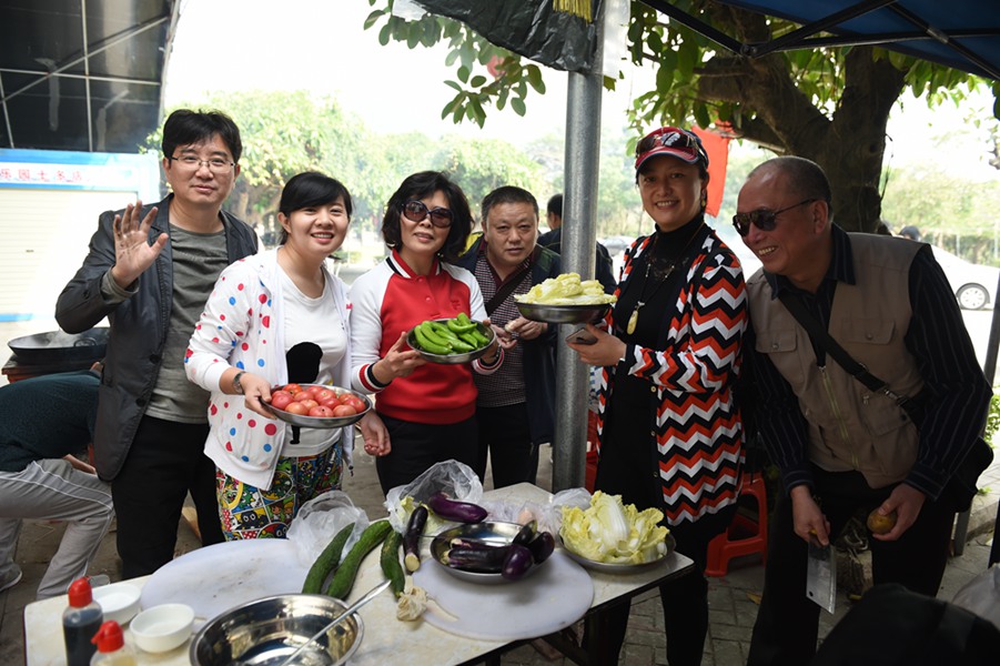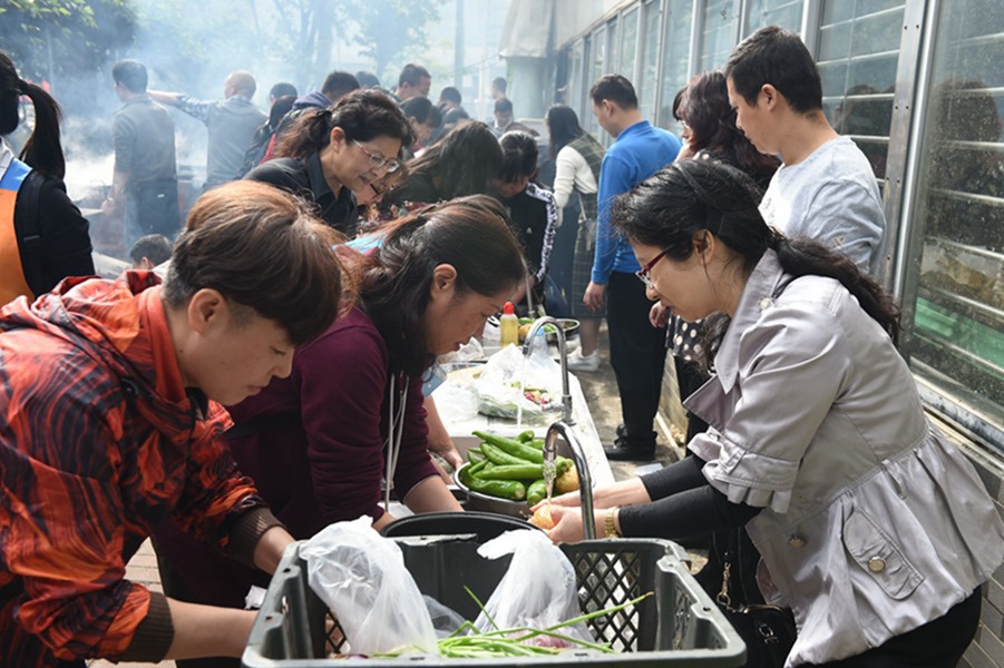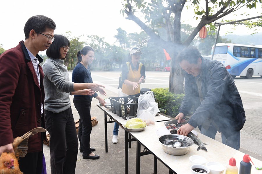 尤其是野炊环节实验俊男靓女们的厨艺大比拼,可谓是热火朝天,热闹非凡,把整个秋游活动推向了高潮。捉鸡捞鱼,淘米洗菜,起火生灶,剁肉切菜,抡勺掌厨,煎炒炸绘……平日校园里风流倜傥睿智文雅的老师们瞬间变成了一个个活泼可爱的“猎人”,朴实勤劳的农夫,技艺精湛的大厨,每个小组都全员参与,分工明确,众志成城,每个组员都争分夺秒,各显神通,为本组夺取本次金厨争霸赛的大奖出谋划策,添柴献力。