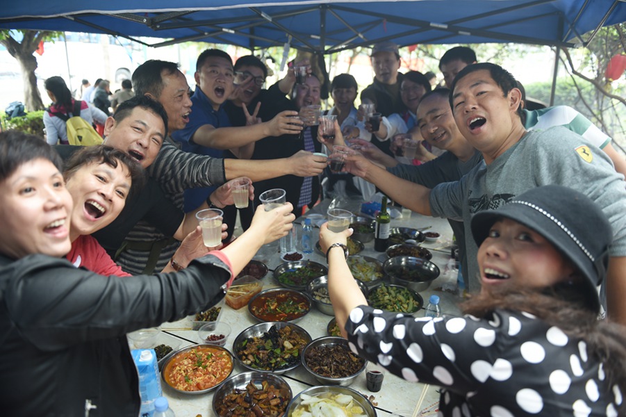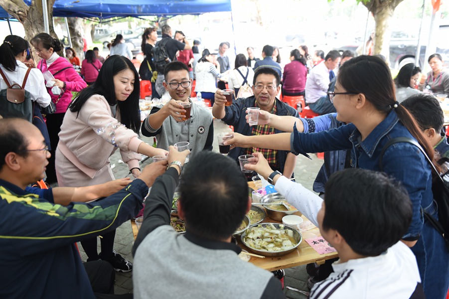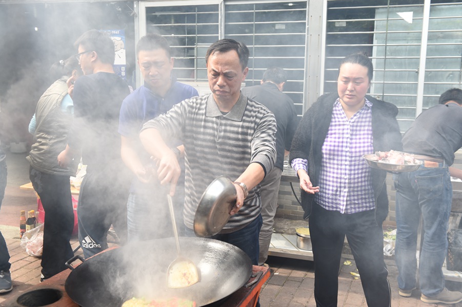 众人拾柴火焰高,众人协作饭菜香。十一点半左右,很多小组已经陆陆续续将喷香美味的饭菜端上饭桌了,有大盘鸡,口水鸡,白切鸡,水煮鱼,酸菜鱼,红烧鱼,青椒茄子,肉末茄子,蒜蓉茄子,蒜蓉生菜,番茄炒蛋,凉拌黄瓜,清炒黄瓜,酸辣土豆丝,干煸土豆,地三鲜等等,十二点左右,各个小组的饭桌上基本上都被各自的劳动成果放满了,老师们也逐渐停下手中的工作,一个个带着丰收的喜悦围坐在饭桌旁,迫不及待地拿起碗筷享受自己动手烹制的美食,边吃边热情地向食堂的大厨评委、向临桌、前后桌展示自己的劳动成果:只见餐桌上川菜、粤菜、湘菜、东北菜……南北菜式,应有尽有,一盘盘,一道道都色香味俱全,让食堂大厨评委都不禁感叹:中学部的老师真是卧虎藏龙啊,以后我们要更多交流,互相学习!听了大厨的夸赞老师们吃得更欢乐了,全程津津有味,席间欢声笑语,直到“光盘”才心满意足地起身。最后大厨评委们根据菜的刀功及成品的色香味等综合因素对各个工会小组的菜肴打分,初三年级组,学生处,教务处的菜品脱颖而出,其他各工会小组的菜肴也让大厨们赞不绝口。(文/王倩 图 /电教室)