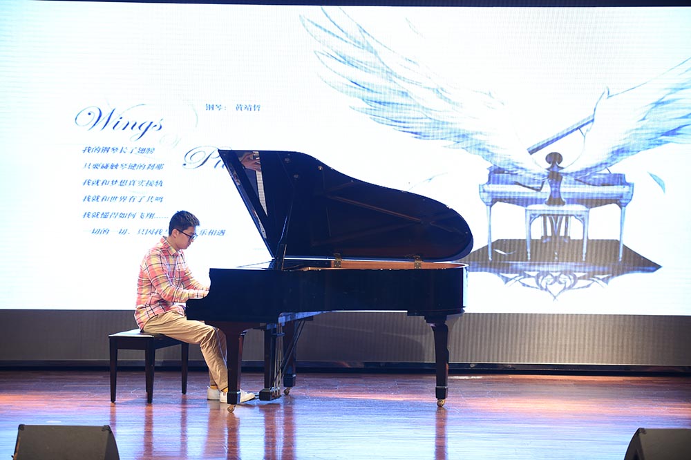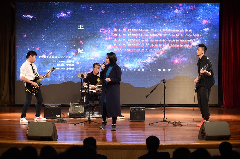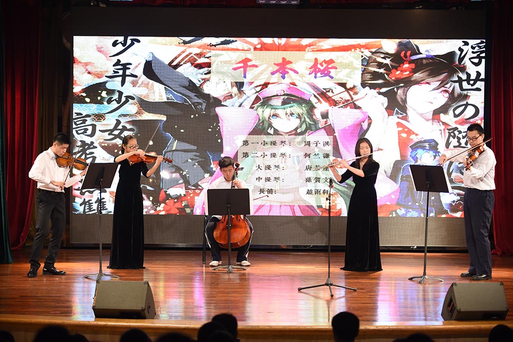 主持人简洁开场之后,灯光渐暗,舞台前方三块屏幕播放“日冕”片头视频,恢弘震撼。随后幕布缓缓拉开,熟悉的流行摇滚响起,器乐社的LEAK乐队以一首《王妃》点燃了整个现场,极具力量的节奏旋律带来了日冕的初光。紧接着是一首反战意义的和风歌曲《千本樱》,如此一首耳熟能详的初音歌曲,经由改编,重新在舞台上以弦乐五重奏的形式演绎呈现。当最后一个音干净利落的消失之后,一架钢琴被缓缓推入舞台中央,黄靖哲同学带来的一首《Wins of piano》带领我们走进古树旋律的温柔乡;而另一首双木吉他曲《风向仪》更把这份柔情在每个认真聆听的观众心中编织成了一朵柔软的花。