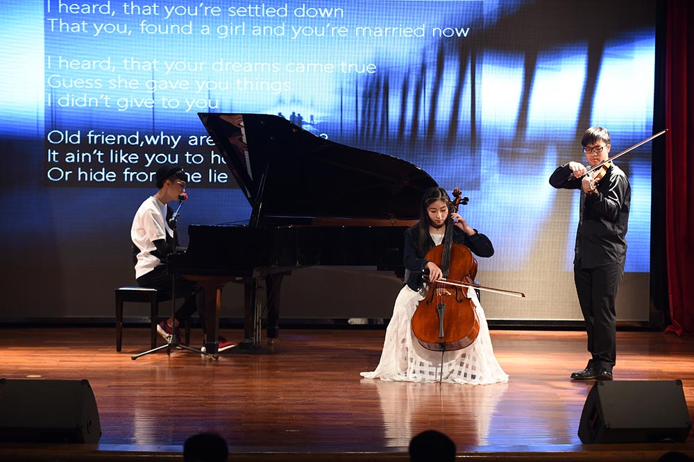 接下来上场的节目是高二年级的学生流行乐队Fusion,热衷于改编流行歌曲的他们带来了欧美天后Adele脍炙人口的歌曲《Someone like you》,再次引起全场沸腾。在阵阵掌声中,器乐社副社长阮博禹独自持琴上台,用木琴指弹演绎了一曲极具中国风的曲目《枫桥夜泊》,琴弦一击一勾中,蕴藏格律严谨的悠扬古风。器乐社何竺谦的原创曲目《假面舞会的A大调华尔兹》,由他本人担任小提琴及廉世佳担任钢琴演奏,这首曲子充分展现了社员何竺谦出色的创作能力和社团丰富的音乐性。