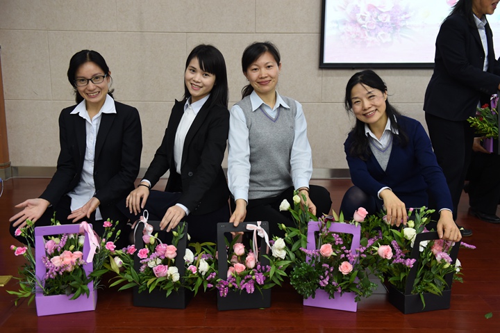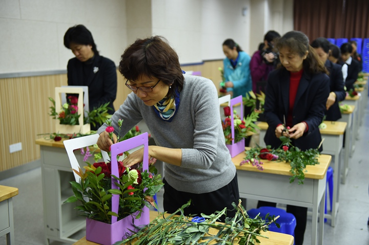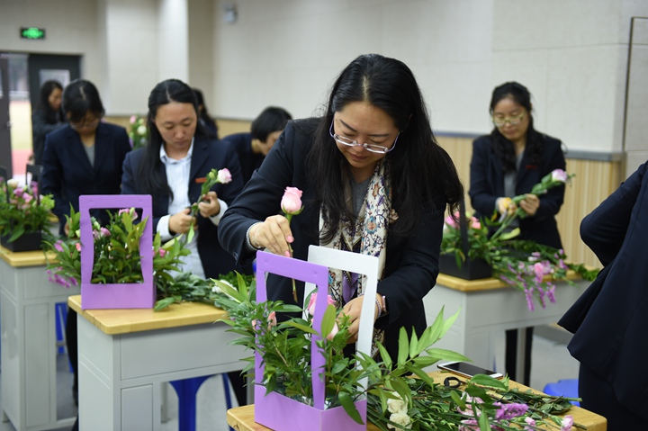 温柔明媚的三月悄悄地向我们走来。三月,一个属于花的季节,一个属于女人的节日!在国际“三•八”妇女节来临之际,为进一步提升女教工的生活品位,在龙校长的大力支持下,中学部开展了系列活动。3月7日下午4点,满心期待的女同胞们提前聚集在西楼多功能教室,走进艺术沙龙——插花课堂。课桌上整齐摆放着绚丽多彩的鲜花、娇翠欲滴的绿叶,以及精致的纸花篮和飘逸的彩带,温馨的布置令人陶醉。