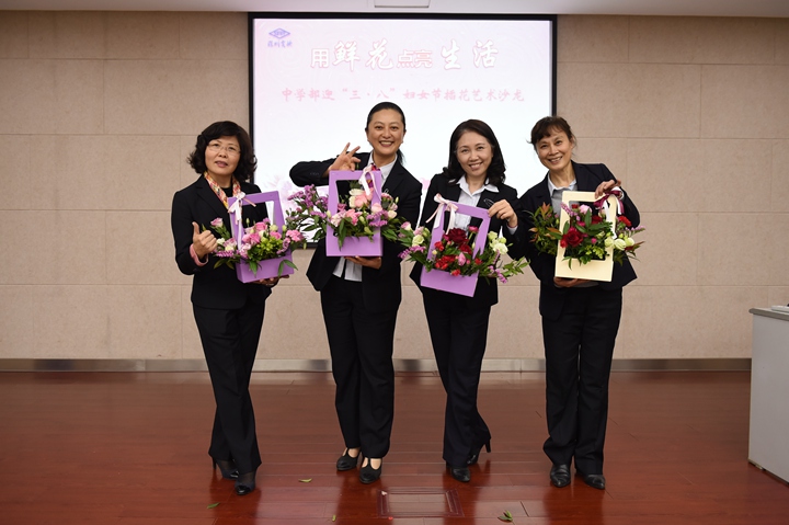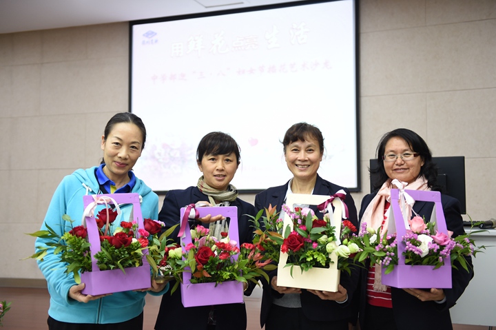 艺术沙龙分三个环节,一是插花讲座:专业插花师进行现场讲解,让老师们先掌握一些插花的基础知识与技巧;二是花艺DIY:每位女教工将手头上的花材(洋桔梗、玫瑰花、康乃馨、勿忘我等)修枝剪叶,讲究颜色搭配、层次分明插进花泥,设计艺术造型,置入花篮,将自己对美的理解编织到鲜花绿叶中,对幸福的感悟寄托花语;三是美丽齐分享:设计好花篮后,女神们齐当花仙子,组团摆拍,装扮OFFICE,点亮生活,幸福满多FUN。