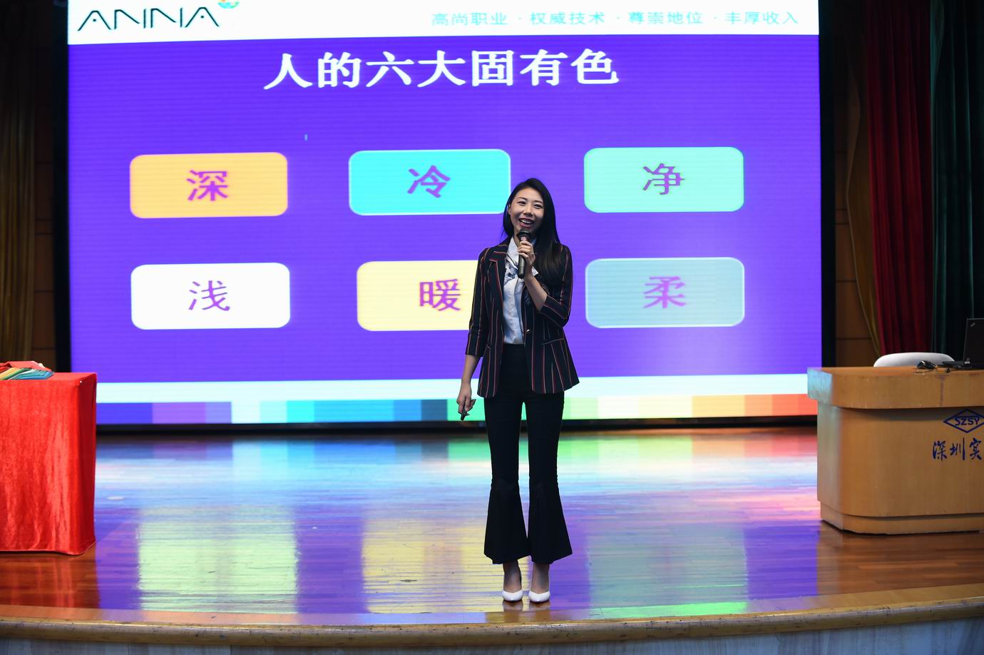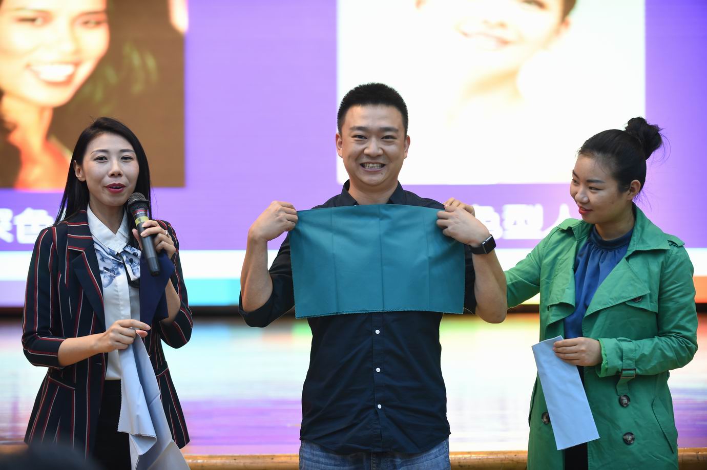 讲座开始,吴老师就通过真实案例让我们意识到——人际交往中,服饰很大程度上反映了一个人的社会地位、身份、职业、收入、爱好及一个人的文化素养、审美品位。接下来,她向我们介绍了浅色型人、深色型人、净色型人、柔色型人等八大不同型人。为了让我们更精准地选择适合自己的色系,吴老师现场随机点评在座老师并邀请有代表性的老师上台互动,现场一片欢声笑语。在了解了自己的色型之后,我们在吴老师的指导下找到了适合自己的穿衣风格。少女、时尚、优雅、少年、古典、自然、浪漫等等,总有一款风格适合你。