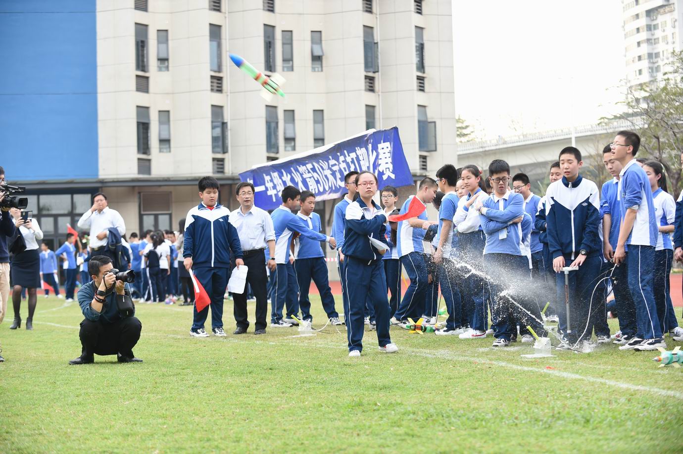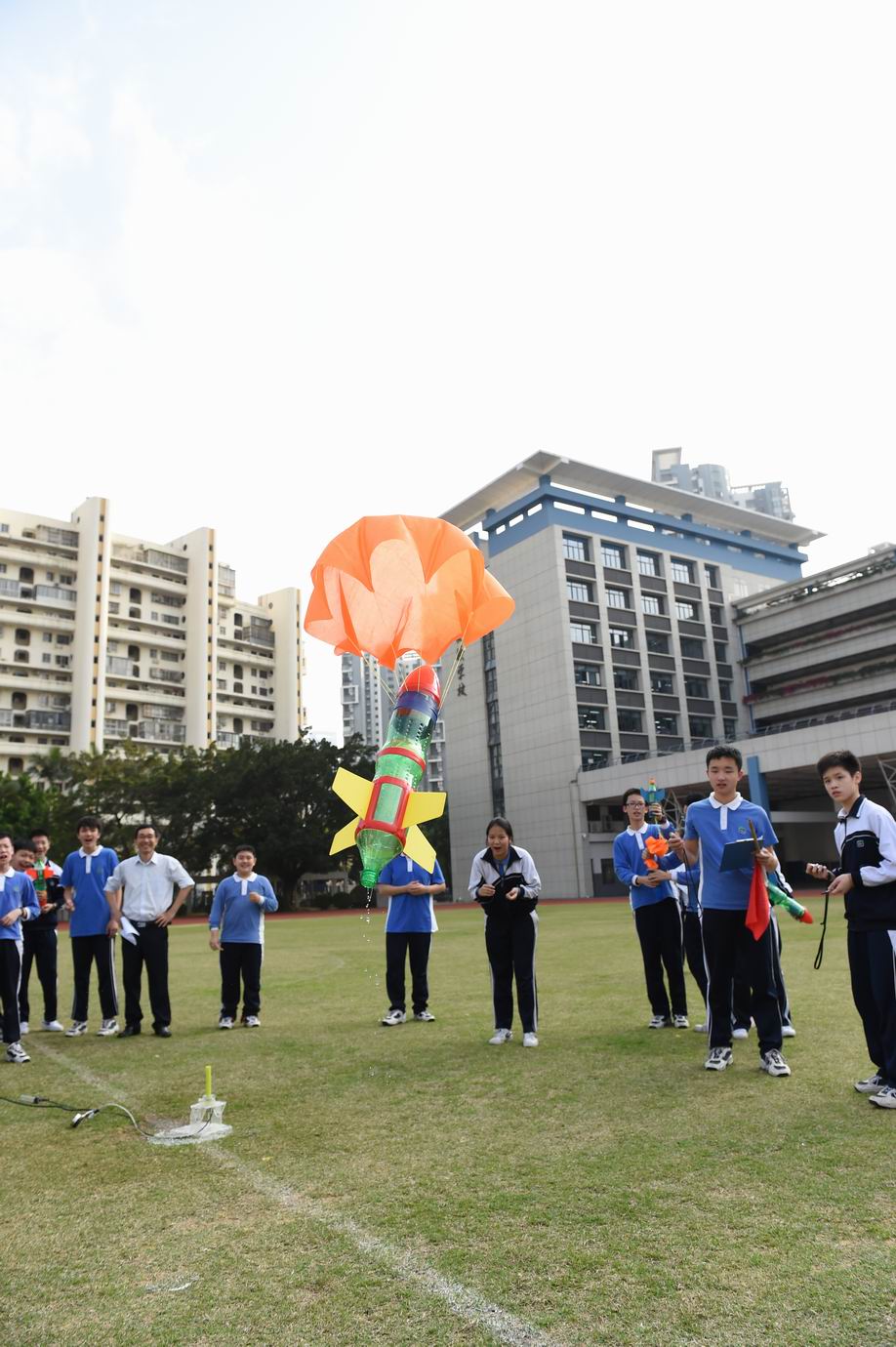 初一年级“水火箭50米定点打靶比赛”和初二年级“水火箭滞空比赛”,各式各样的水火箭赚足了观众们的眼球。每一枚水火箭的发射,都伴随着惊叹声与赞美声,在操场的上空回荡,久久不能散去。