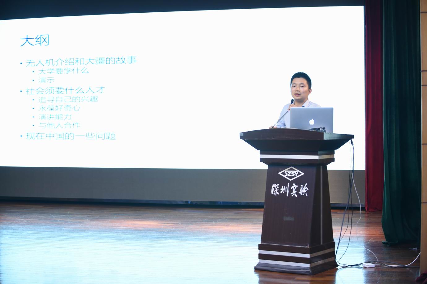大疆创新科技有限公司研发副总裁、05届深圳实验学校高中毕业生王铭钰主讲的科学报告会“永葆好奇,独立思考,创造美好世界”,拉开了本届科技节的序幕。报告会上,王铭钰讲述了大疆创新成立以来艰难的发展历程,展示了大疆创制的无人机等产品,解说了其理念与原理。并以此引出自己的成长经历,分享了自己求学、创业的感受和体会,激励学弟学妹们永远保持一颗好奇的心,独立思考,勇于追求自己的梦想。