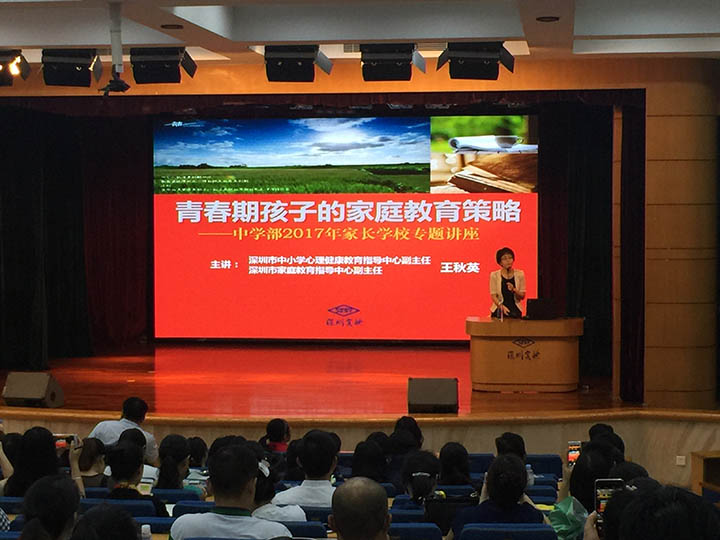 青春是美丽而又短暂的,为了让青春之花绽放于幸福的原野,不断增进家庭教育对孩子成长的作用,加强家校间的深入合作,7月7日上午,中学部在小礼堂举办了一场《青春期孩子的家庭教育策略》专题讲座,特别邀请到深圳市中小学心理健康教育指导中心副主任、深圳市家庭教育指导中心副主任王秋英老师主讲。初一年级全体家长及老师聆听了本次讲座。