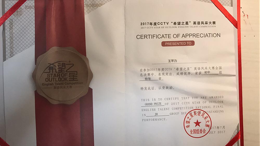 ——中学部学生荣获2017CCTV“希望之星”英语风采大赛特等奖、一等奖