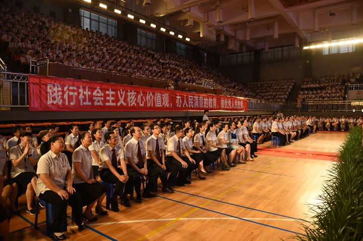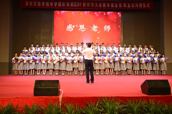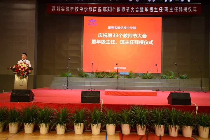 九月爽朗的秋风,迎来了新学期的期许;九月硕果的飘香,奏响了教师节的序曲。9月8日清晨,深圳实验学校中学部在校文体馆隆重召开第33个教师节大会暨年级主任、班主任的拜授仪式。全校师生以及应邀的家长参加了本次大会,大会由学生处杨宁主任主持。