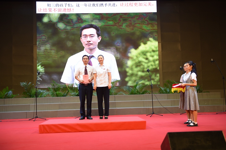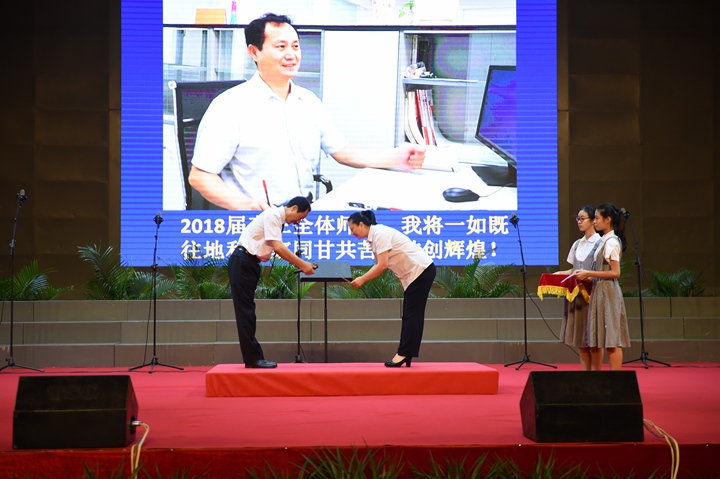 首先,师生共同欣赏了新学期《教师风采》的短片,这部短片浓缩了每一个中学部的老师倾情上课的美丽瞬间,激起了现场同学们的一阵阵掌声。随后,进行了年级主任、班主任的拜授仪式。各年级主任和班主任们依次上台接受龙校长的嘱托,一声声“我会尽心尽力工作,请校长放心”既是对校长许下的庄严承诺,又是对同学们尽责的心声。舞台背景上播放着每一位老师对同学们殷切的期许和祝福。传递出老师们崇高的品质和对教育事业、对学生成长负责的专业精神。各年级同学发自肺腑的高亢洪亮的祝词,诠释了对老师真诚的爱与感激并向最亲爱的老师致敬!