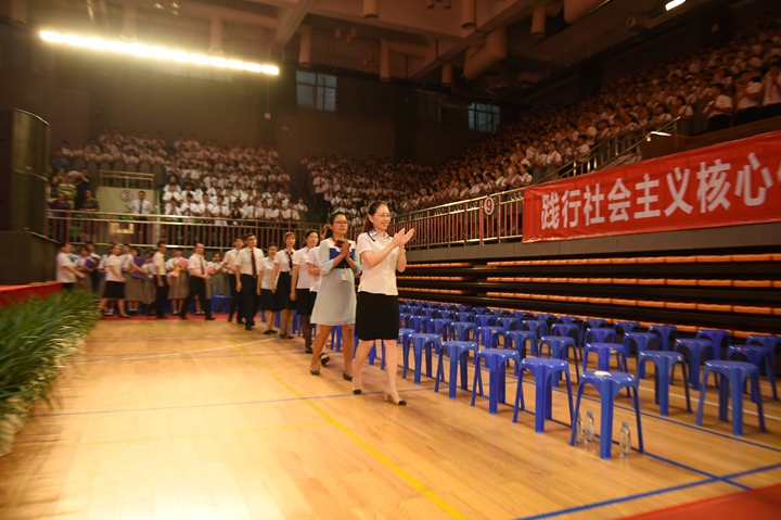 伴着清晨的阳光,踏着激昂的旋律。在全校学生的掌声和欢呼声中,龙校长带领着中学部的全体教师,踏着坚定的步伐,挥手步入会场。大会在嘹亮的国歌声中拉开了帷幕。