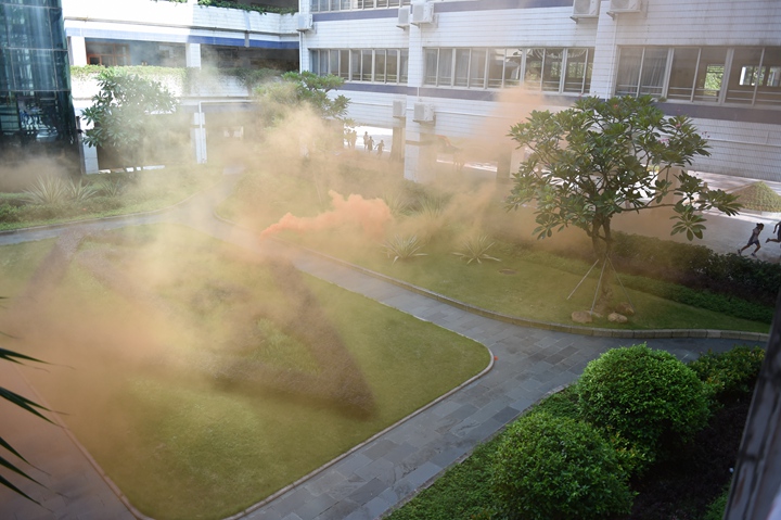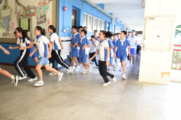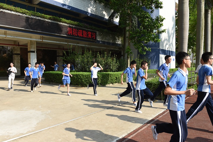 当天下午2点整,高中年级学生宿舍楼警铃响起,“宿舍消防安全疏散演习”正式开始,在龙校长和老师的指挥下,全部学生迅速有序地通过安全通道到达指定集合地点。下午3点55分,全校师生在教学楼又进行了“安全消防疏散演习”。一阵急促的警铃响起后,烟幕弥漫,东、西两座教学楼内的全体学生,在老师们的指导下,俯下身子,手捂口鼻,在三分钟之内,全部集结在大操场的指定区域。