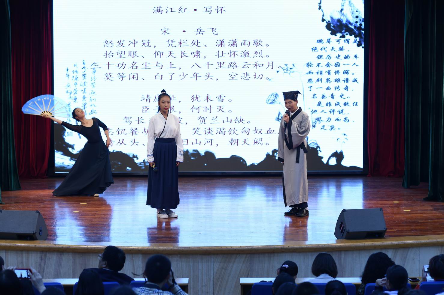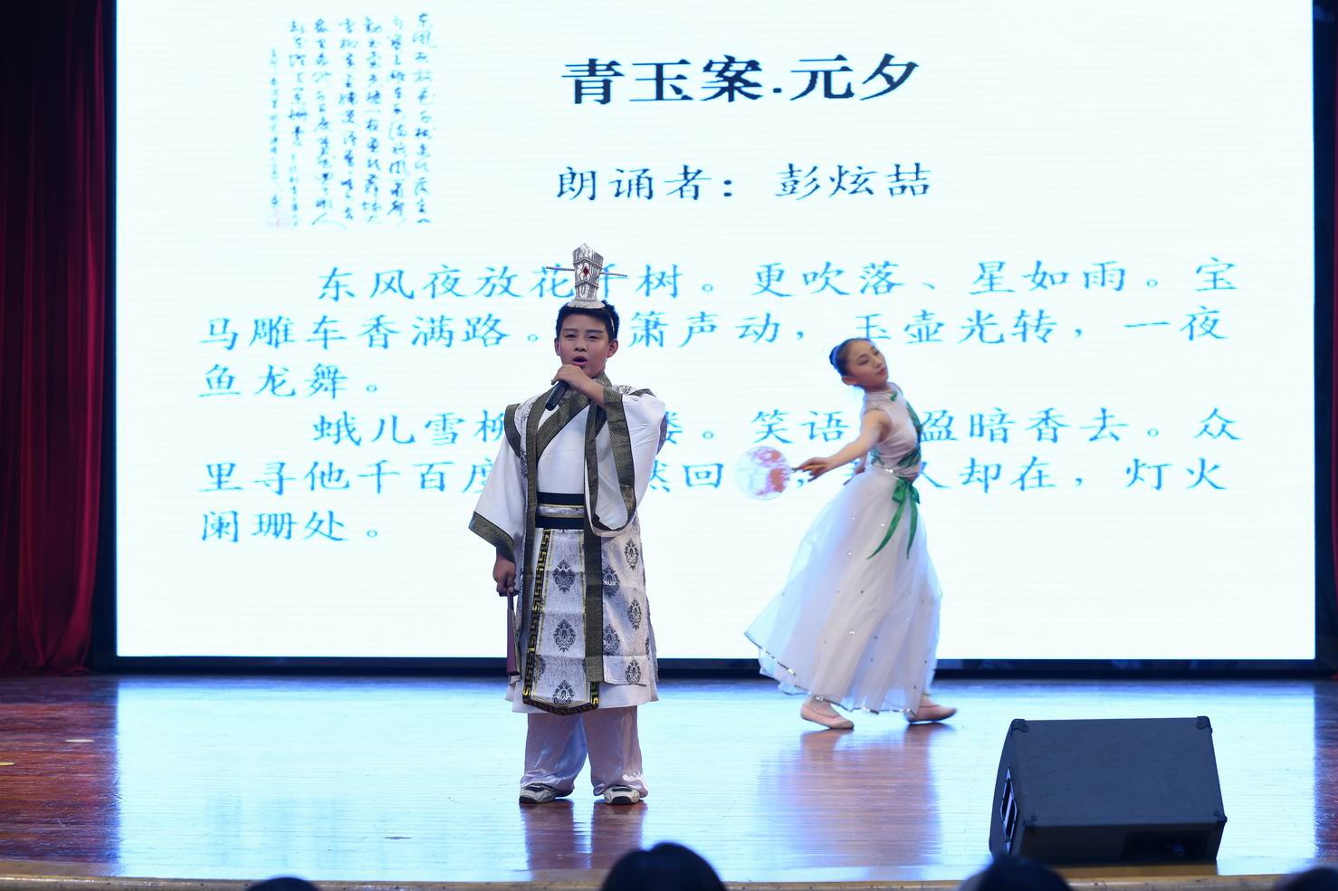 此次活动,是继“我与经典有约”、“腹有诗书气自华”等系列经典阅读活动后的又一次精彩展示。活动首先以“宋词赏读”为主题开展,各班同学自编自导精心准备节目,以愁、边塞战歌、李清照、辛弃疾、相遇、少年、怨、江山如画为主题词深情朗诵,辅以舞蹈,音乐等艺术形式,词舞相合,朗诵者卷舒自如,舞者舞姿曼妙,配以意境空明的音乐,生动演绎“宋词滋味”。本学期,在老师的推荐下我们很多同学看了林语堂先生的《苏东坡传》,每个人心中都有了一个不一样的苏东坡,在“别样东坡”环节,每个班都集体诵读一首自选东坡词,然后年级集体诵读《水调歌头.明月几时有》,通过集体吟咏那一首首传唱千古的名篇,去贴近那颗伟大美好的灵魂。