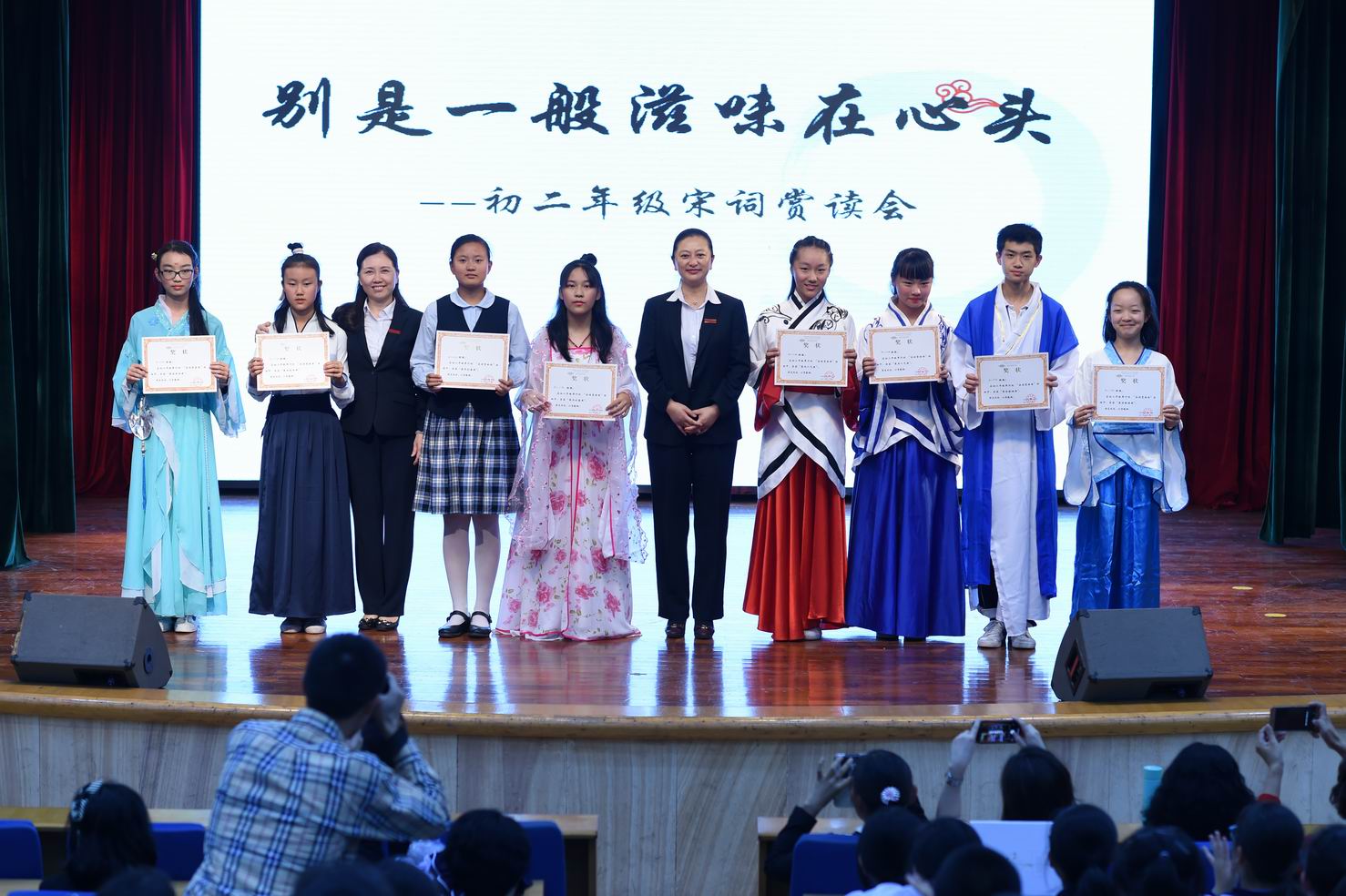 赏读中,有的慷慨激昂,振奋人心,抒发了当代中学生敢为担当、锐意进取的壮阔胸怀;有的气势磅礴,感情激越,震撼全场;有的音韵谐美、节奏舒缓有度,精妙的表现了至真至性的情感。一首首优美动听的经典宋词,震撼和感染着在场师生,同时也展现了我校学生良好的精神风貌、深厚的文化底蕴和精湛的艺术素养。活动最后,通过评委综合打分,评出了最佳朗诵奖、最具人气奖、最佳表演奖、最具创意奖等四个奖项。龙校长、王主任为获奖班级颁奖,并与领奖代表合影留念。