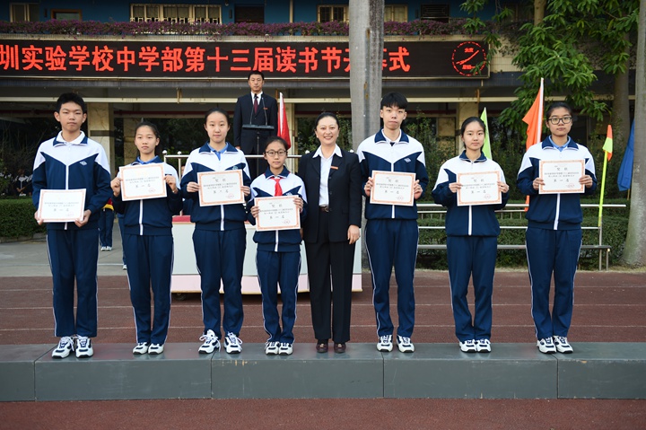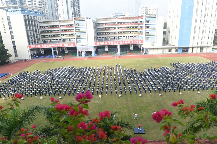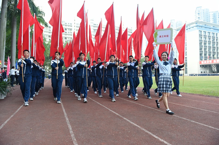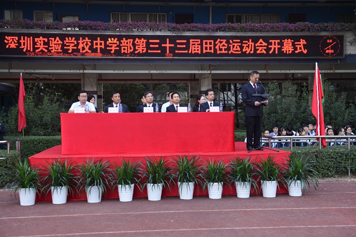 迎着鹏城十二月煦暖的阳光,校园内,彩旗迎风招展,运动健儿们踏着坚实有力的步伐有序入场。他们口号响亮,步伐矫健,英姿飒爽,象征实验人文精神的生生不息。各班方阵一一走过主席台,整齐的步入运动场,以必胜的信心和饱满的激情接受领导、老师和家长们的检阅。入场式结束后,衷敬高校长宣布本届运动会开幕!中学部副部主任教务处王兵主任致开幕词,她期望:新时代的中学生,不仅应该具有高尚的品德、优异的成绩、深邃的思想、优雅的举止,还应该具有强健的体魄,必须学会强身健体,真正成为全面发展的优秀人才。这不仅关系到你个人的健康,更关系到一个家庭的幸福和国家的兴旺。运动员代表高三(3)班张文远、裁判员代表唐尧老师先后宣誓,高亢的声音、掷地有声的誓词,传递出对比赛的高度投入和认真负责。开幕式上,各班进行了广播操比赛,在平时严格要求、强化培训后,同学们展现出动作有力,举手、抬脚、弯腰、转身、跳跃整齐统一,动作中充满着自信,在实验蓝白相间运动服的陪衬下,彰显出实验学子朝气蓬勃,团结向上的精神风貌。