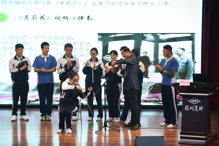 12月25日下午4:05,中学部高一高二全体师生齐聚小礼堂,聆听著名锯琴演奏家李元庆老师讲述锯琴的魅力。