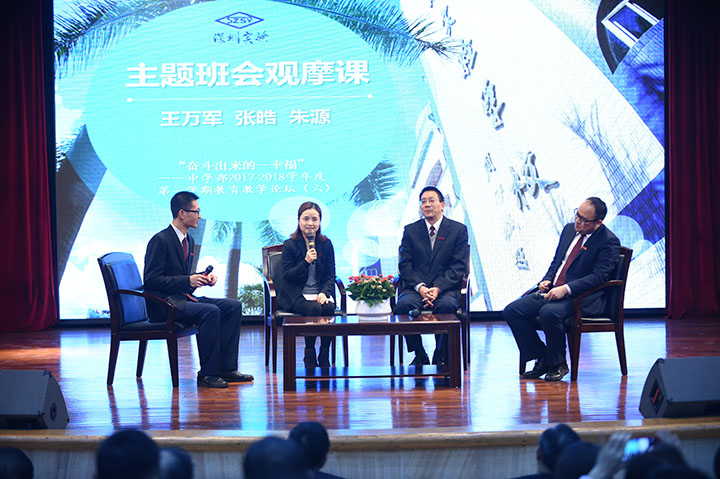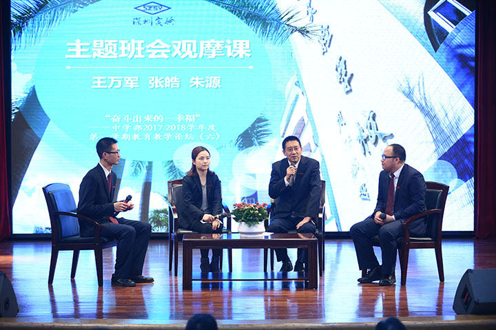 接着,举行了教育教学论坛。第一板块是主题班会访谈,请到了王万军主任、张皓老师、朱源老师作为嘉宾,聚焦“主题班会观摩课”的所想所感。教育的幸福往往来自于学生,教育学生往往需要强有力的德育工作,中学部主题班会观摩课已经成为了中学部学生德育工作的重要帮手。三位嘉宾分别从自己的角度谈了对主题班会的感受。王万军主任总结了这学期主题班会观摩课所体现出来的新特点和新进步,再次突出强调了主题班会课对于教师的成长作用;张皓老师就主题班会的选题问题给出了自己的建议;朱源老师分享了自己准备主题班会的过程和思考。台下的老师们都非常认同,掌声雷动。
