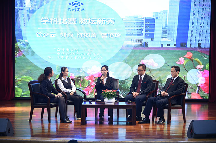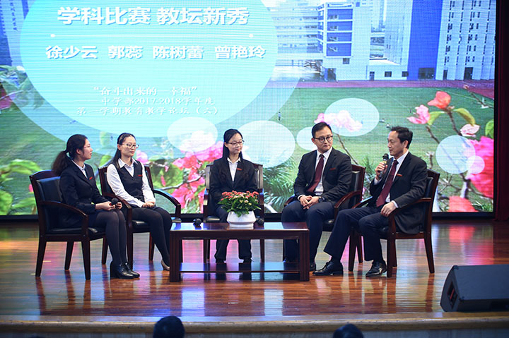 论坛的第二版块是教师学科竞赛访谈,请到了徐少云主任、郭蕊老师、陈树蕾老师、曾艳玲老师作为嘉宾,讨论教师参加学科竞赛的经历感受。徐少云主任首先概括性地总结了学科竞赛对于教师的重要作用与意义,鼓励教师积极主动参加学科竞赛,提高自身教学水平;郭蕊老师描述了自己参加10月举办的“深圳市中学教师教育教学技能大赛”的过程,分享了自己的所想所感;陈树蕾老师分享了自己参加“深圳市中小学语文教师朗诵语文课本篇目大赛”的见闻以及自己的思考;曾艳玲老师分享了自己参加实验学校教坛新秀大赛的心得体会,表达了自己的感恩,这也说出了老师们共同的心声。大家都表示会在各类教学比赛中多多打磨自己,力争成为更优秀更卓越的教师!