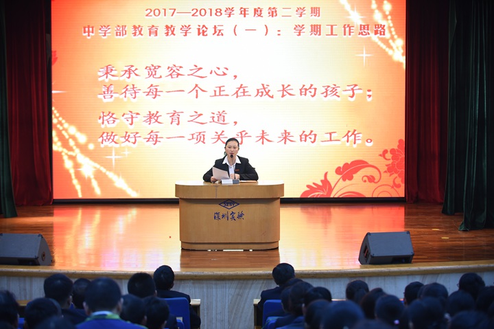 从2月25日开始,中学部各行政部门以及各年级的老师已投入到新学期的工作中,为新学期的顺利开学提供了保障。中学部召开了全体教工大会,会上龙校长做了主题为“秉承宽容之心,善待每一个成长中的孩子;恪守教育之道,做好每一件关乎未来的工作。”的讲话,新学期对全体教工提出了新的要求,为同学们的终身发展做好引路人、好伙伴和人生导师。