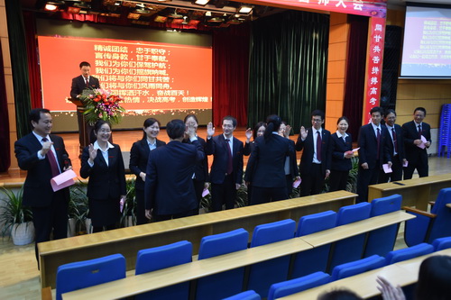 老师们宣誓环节。回顾过往,在同学们成长的三年里,有一群人始终在身边陪伴;在同学们求知求学的路上,有一群人指引他们前行;今天同学们为理想发起冲锋的时候,还是同一群人愿为他们摇旗呐喊,保驾护航。这就是全体高三年级的老师。大会上,徐少云主任带领全体高三教师庄严承诺:“精诚团结,忠于职守,言传身教,甘于奉献,为你们保驾护航,为你们摇旗呐喊,与你们风雨同舟,奋战百天,创造辉煌!”,喊出了高三老师的决心和气势,展现了教师们和学生一起发奋的风采。同学们看到了同样坚定、同样努力的教师团队,情绪高昂,掌声雷鸣。