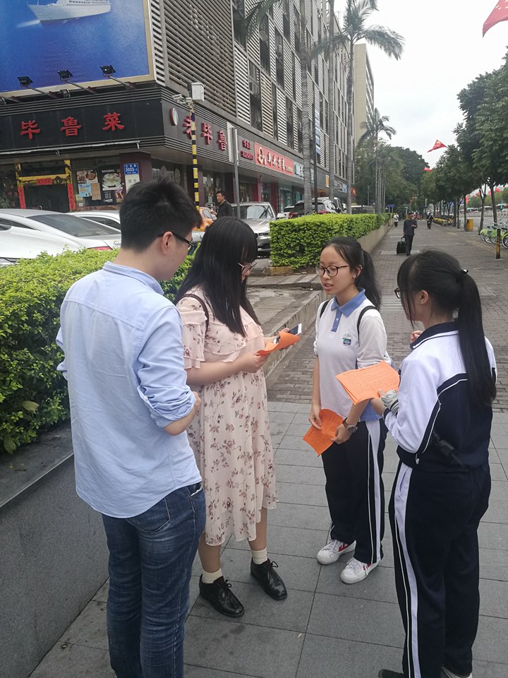 同学们还向途经的市民派发事先印制好的做文明骑行使者宣传单,向他们介绍我们此次活动及共享单车或平时使用的一些注意事项。期间,一些外国朋友们好奇地询问我们这次活动,同学们热情洋溢的回答。一些同学拿着相机,记录下一位位认真整理单车同学们,一个个积极向路人宣传活动排放传单的身影,一张张带着汗水却又洋溢着灿烂笑容的笑脸,记录下这段很有意义的时光。