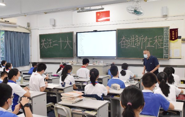 为了增强同学们热爱祖国、热爱生活的美好情感,2022年9月30日,我校全体师生参加了“百余年沧桑吟诵中华巨变,七十三华诞谱写盛世华章”主题晨会活动。当天下午,七年级各班在教室召开“喜迎国庆,盛世中华”主题班会,班主任老师们为同学们讲解了新中国成立73载的成就和历史启示,同时引导同学们努力学习科学文化知识,增强实践能力,勇敢追求心中梦想,为新时代共筑中国梦贡献力量。2022年10月17日,各班又召开“关注二十大,奋进新征程”的主题班会,通过主题教育,引导同学们在新时代的征程上,用颗颗红心庆祝党的二十大胜利召开。