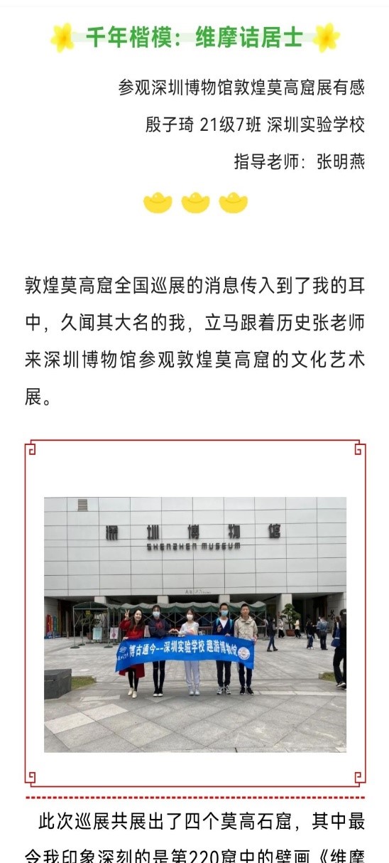 为了贯彻落实“双减”政策,中学部历史学科积极探索“双减”背景下的教学模式,创新摸索历史核心素养的落实,开启历史学习“新玩法”, 用主动性创造性的高阶学习,取代被动接受的重复练习促进孩子全面发展,实现减负不减质的教育目标。本着探索的初心,中学部历史学科组开始了《趣游博物馆》系列和《深圳故事 今古传奇》系列思考之旅和实践之旅。
