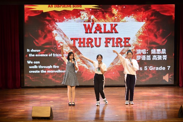 七年级5班《Walk Thu fire》。当大家还沉浸在上一段歌舞时,舞台上的聚光灯迅速照耀出5班3位同学的身影,他们闪亮登场了!同样是一首歌伴舞形式的作品,他们的曲目是《Walk Thu fire》。这首英文歌曲的节奏性很强,台上的3位同学都很好的掌控了节奏,舞蹈动作到位,在场的观众们也击掌为他们打节拍。