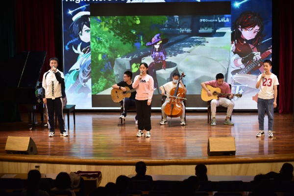 七年级6班富有新意的原神游戏舞蹈。6班的比赛节目一下子又将沉浸在美妙音律中的同学们拉回到了现实。他们用流行游戏作为背景及主旋律,由吉他、大提琴和钢琴演奏配合富有创意的表演动作,犹如一支管乐团,让同学们欣赏到了一场别样的精彩。