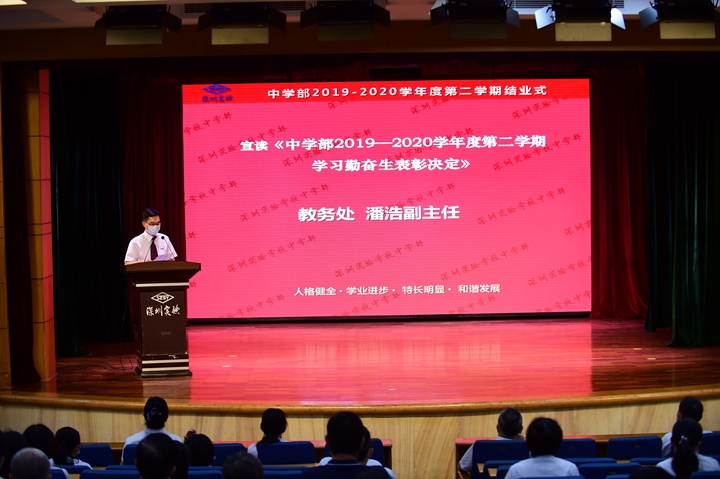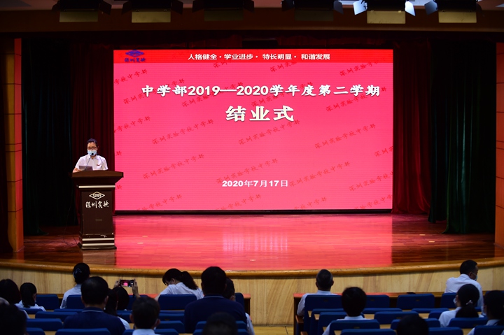 一场突如其来的新型冠状病毒,让2020年显得格外与众不同。疫情阻隔了我们交往的距离,却阻碍不了成长和拼搏的脚步。难忘的线上学习经历,弥足珍贵的复学点滴,我们终将镌刻于心,记录下这段耐人寻味的“疫”时光。暑假的脚步悄然临近,一学期的学习生活即将画上句号。7月17日下午,中学部全体教师齐聚一堂,在五楼小礼堂隆重举行了2019-2020学年度第二学期结业式。大会由学生处高丽副主任主持。典礼在庄严的国歌声中拉开帷幕。
