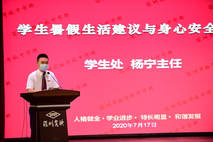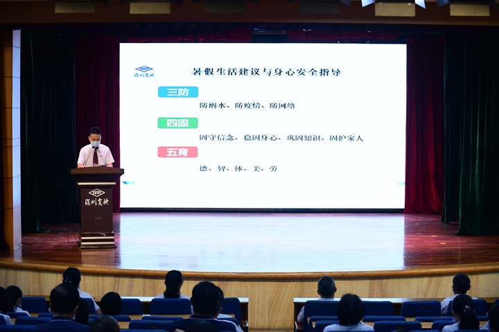 最后,学生处杨宁主任就暑假学生安全做了《暑假生活建议与身心安全指导》专题讲话。从“三防”(防溺水、防疫情、防网络),“四固”(固守信念、稳固身心、巩固知识、固护家人),“五育”(德、智、体、美、劳)三个方面,宣读了学生暑期生活指南,给孩子们敲响安全的警钟,他提醒全体学生疫情尚未结束,防控不可松懈!假期期间,望家长和孩子们坚持做好,孩子离开居住地的,须及时向学校给班主任报告行程及往返日期等情况。期待同学们能够好好安排这一假期时间,牢记安全第一的原则,度过一个快乐而充实的暑假!