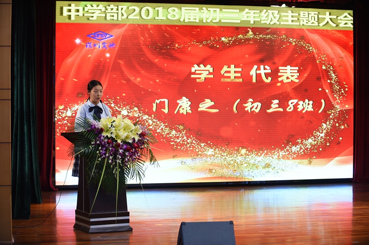 “宝剑锋从磨砺出,梅花香自苦寒来”,每一位初三学子都有自己难忘的记忆。初三八班门康之同学作为学生代表与大家分享了她的感言。她情真意切的发言表达了全体同学为梦想而战、为父母而战、为母校荣誉而战的决心!