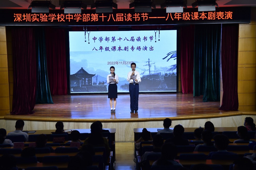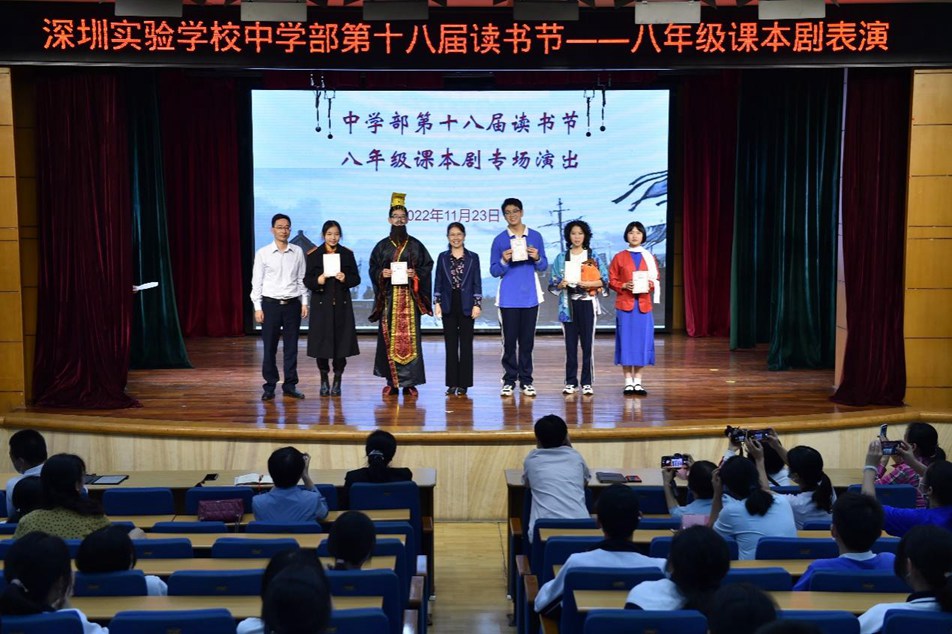 11月23日上午,八年级部分师生共聚五楼小礼堂,课本剧表演活动在热烈的掌声中拉开了序幕。龙校长及部分行政、年级部分师生参加了现场活动,。