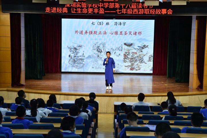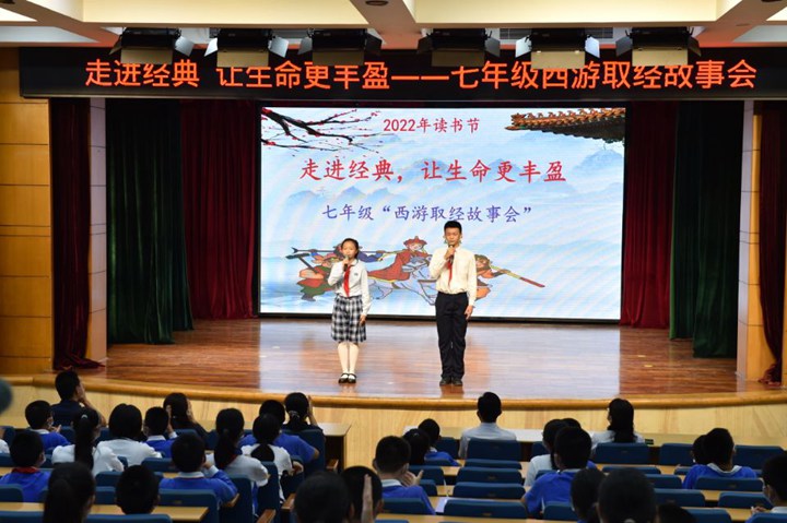 2022年11月22日上午,中学部五楼小礼堂七年级通过线上直播的形式开展了西游取经故事会活动。龙校长及部分行政、年级部分师生参加了现场活动。