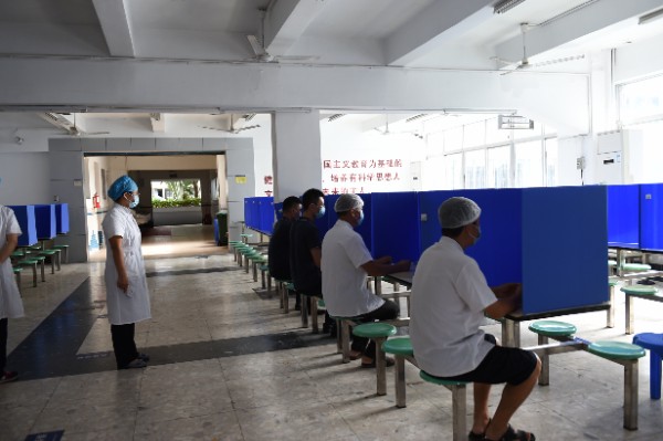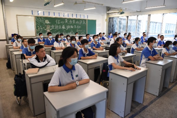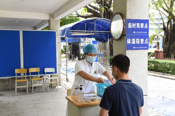 7点20分,深圳实验学校副校长、中学部执行校长龙萍带领行政干部在校门口迎接学生返校。在老师、学生义工、家长义工的组织下,同学们保持一米以上的安全距离,在进行红外线体温测试之后,依次进入校园。寂静的校园,顿时显得生机勃勃。