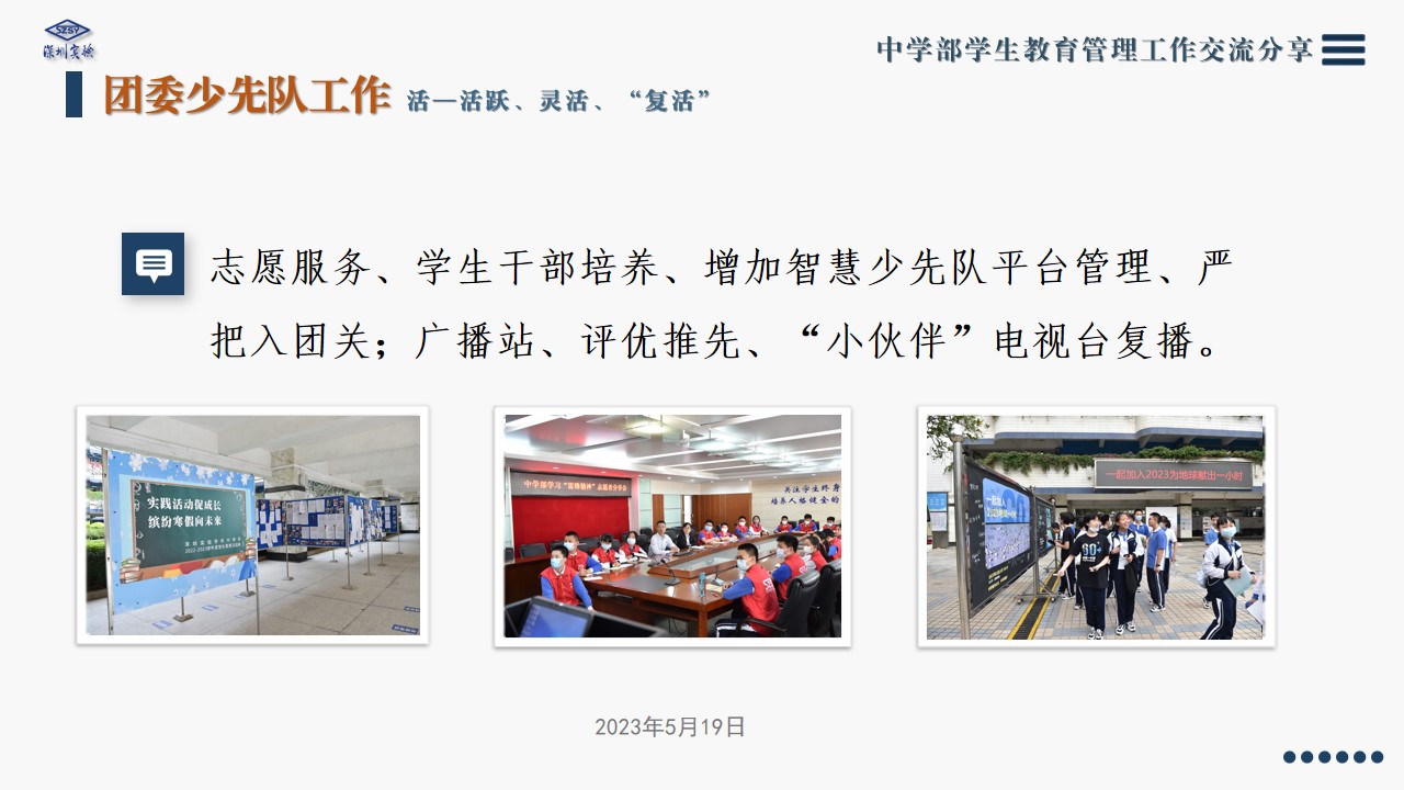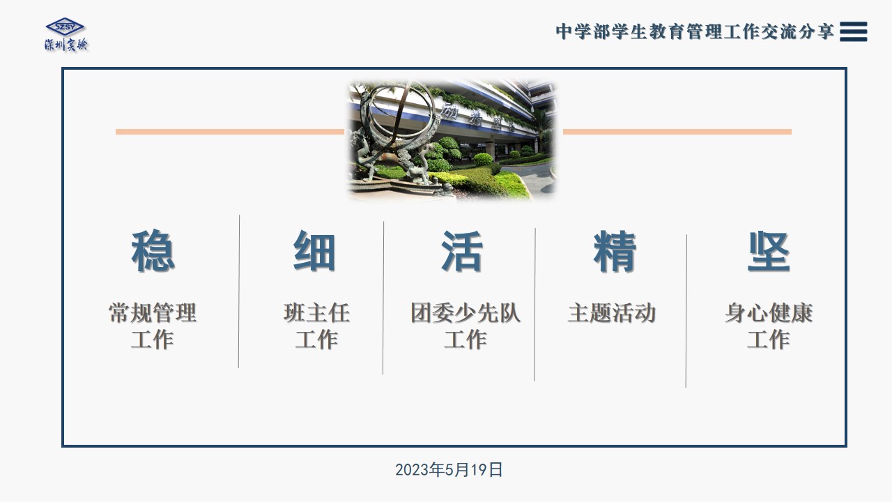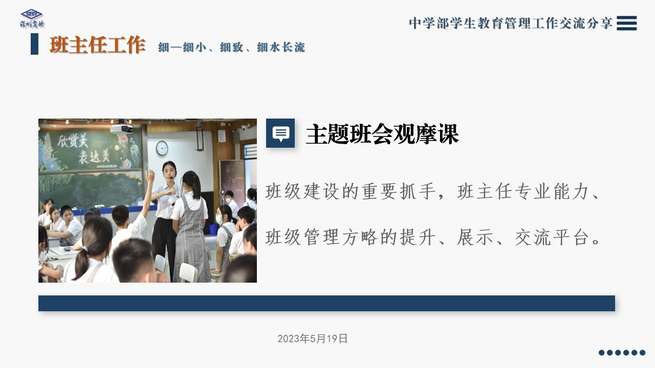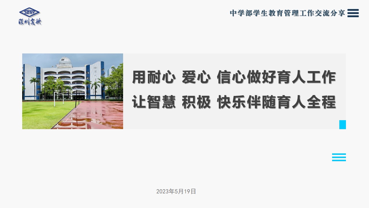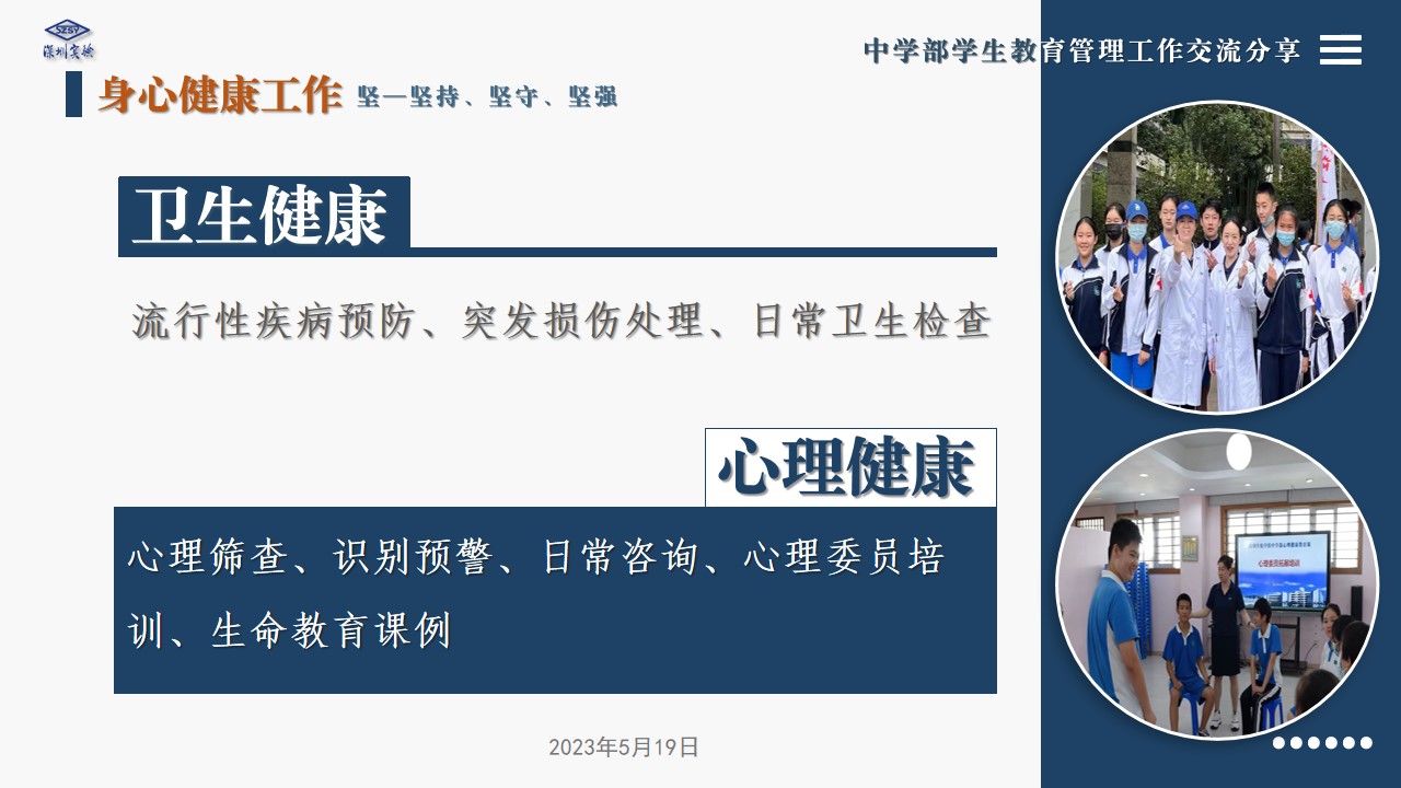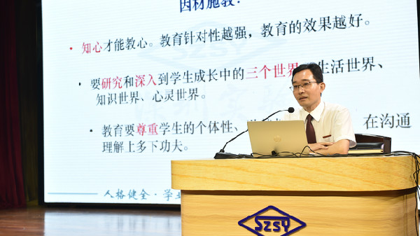 王特:在学生处杨主任的主题发言中,感受到学校在学生管理中的细心用心,彰显着“有温度的教育”。在教务处潘主任的主题发言中,感受到学校在教学中的求真务实,体现着“有情怀的教育”。立德树人责任重大,努力做好老师、做大先生,既要注重言传身教,也要关心爱护学生。愿我们中学部的每一名教师眼里有光、心中有爱,快乐工作、健康生活!