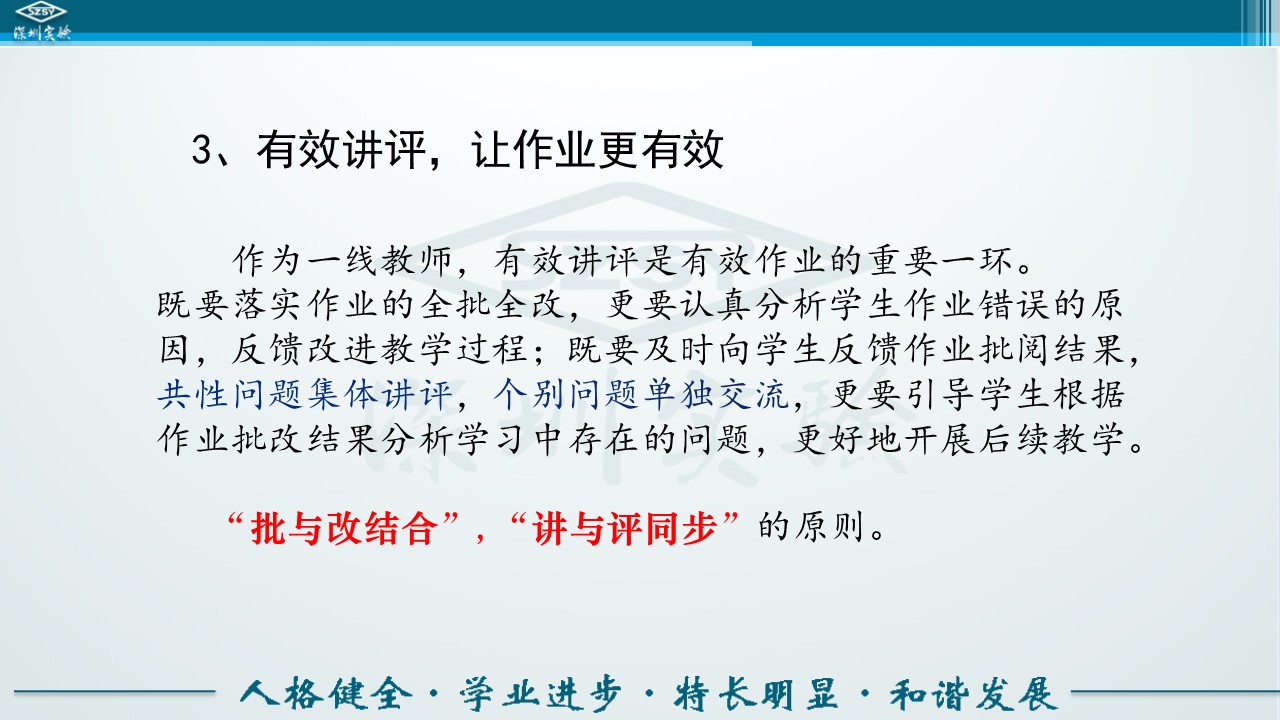 6月9日,教务处潘浩主任在教工大会主题讲话中,首先介绍了人民教育家于漪的事迹和语录,于先生一辈子行走在努力修炼、锻造学识与人格的路上,“一辈子做老师,一辈子学做老师”,这样的境界和追求让在座的老师们敬佩、感动,也引导老师们思考教育初心。对于提升教师自身素质,潘主任用了三个关键字来概括:一是“爱”,教师的事业是爱的事业,只有真心实意的爱学生,才能收到春风化雨、昭苏万物的实效;二是“钻”:要有钻研教材不明底里不罢休的那股劲儿,应求准、求深、求有自己独特的发现;三是“学”:理论学习应放在相当的位置,业务学习应毫不懈怠,深入学,广泛学,视野开阔,功底厚实,才有教好学生的实力。学习完榜样,潘主任随后就作业设计与管理、集体备课、学科组建设等方面,提出了可操作的指导性的建议,鼓励大家“筑牢制度根基 做实做细常规”。