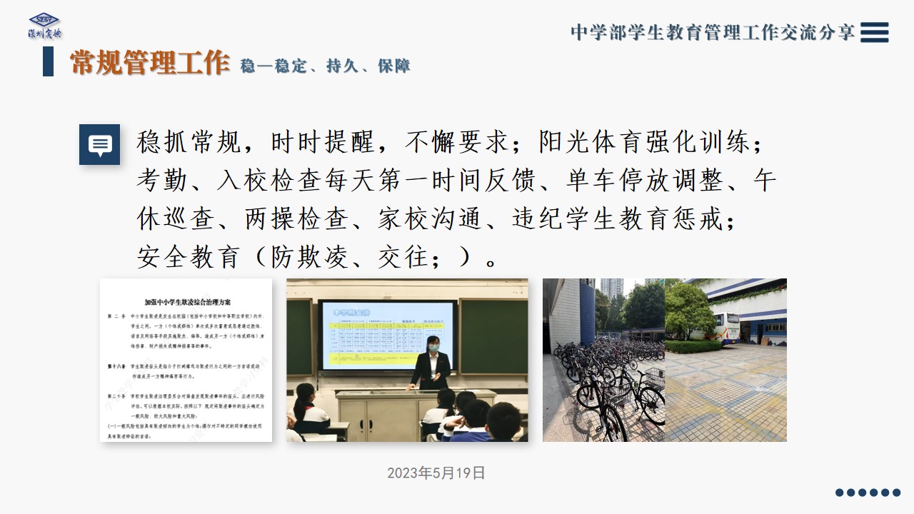 5月19日,中学部副部主任、学生处杨宁主任在教工大会主题讲话中提出,本学期学生处以“用耐心、爱心、信心做好育人工作,让智慧、积极、快乐伴随育人全程”为工作思路,学生教育工作中常规管理是根本,是保障;主题活动是渗透,是成效;总结整改是思考,是优化。随后他着重在几个方面做了具体要求:常规管理工作要“稳”;班主任工作要“专”;团委少先队要“活”;主题活动(活动课程)要“精”;心理健康工作要“坚”;卫生健康工作要“准”。杨主任的讲话体现了教育工作者对学生的用心,同时也对各教育者的具体工作指明了方向。
