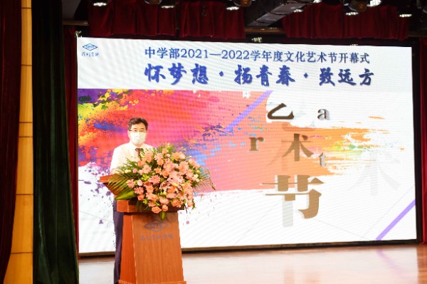 2022年4月25日,深圳实验学校中学部2022年文化艺术节正式拉开序幕。开幕式上,高同宇老师以“美之悟语”为题发言。本次中学部艺术节的准备工作在居家学习期间已经启动,设有歌曲、舞蹈、器乐、美术、演讲等类别优秀作品的征集展示以及专家讲座等活动。