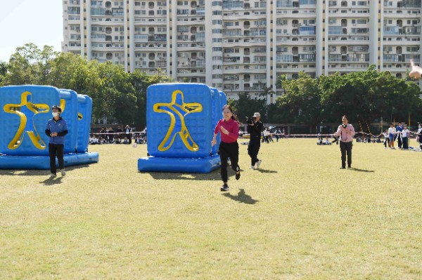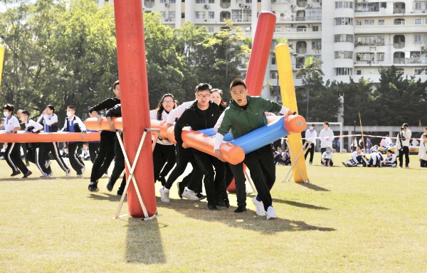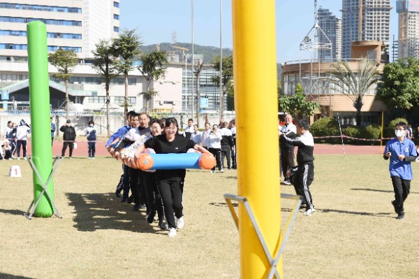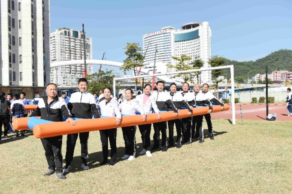 师生趣味运动比赛又为本届运动会平添了一份欢乐,“五福临门”“穿越人形墙”彰显了教职工们的团队智慧和合作精神。