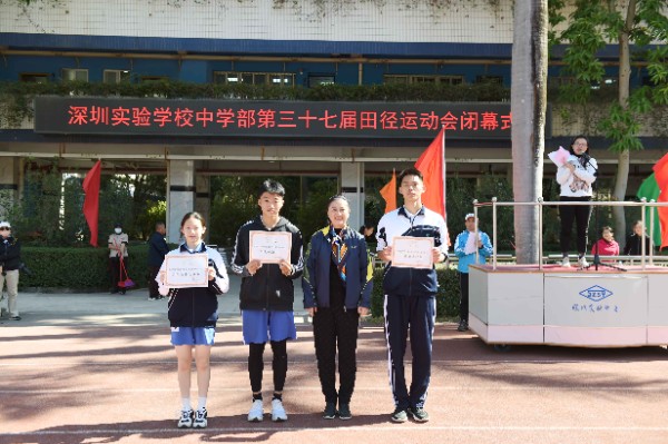 3日上午11时,中学部第37届田径运动会闭幕式在田径场隆重举行。学生处高丽副主任主持闭幕式。总裁判长李文广老师宣读了各班级团体总分名次和突破校记录的运动员及项目名单,最终共有19项个人及集体项目成绩打破校记录。中学部校领导依次为获奖个人、获奖班集体颁奖,龙校长热情地走上颁奖台,为冠军运动员颁奖并合影留念。