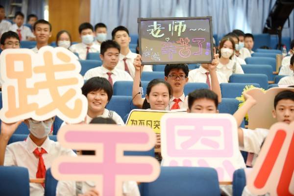 【感恩教育】“感恩教育”是我校健全人格教育的重要组成部分。对于今天的广大青少年来说,感恩更是责任意识、自立意识、自尊意识的体现。拥有一颗感恩的心才更加热爱祖国珍惜当下;才更能体会父母的不易和师长的用心,更懂得去关心帮助他人,更会勤奋学习,主动求知。中学部初一年级利用大型活动和班会时间,抓住契机渗透感恩教育。在第37个教师节庆祝大会暨年级主任、班主任拜授仪式上,初一年级的大合唱《奉献》,表达了他们对师长的敬佩和感恩。在庆祝中华人民共和国成立72周年主题晨会上,初一年级少先队员合唱歌曲《名字叫中国》,表达了师生对伟大祖国的热爱,更唱出了孩子们的感恩之心。