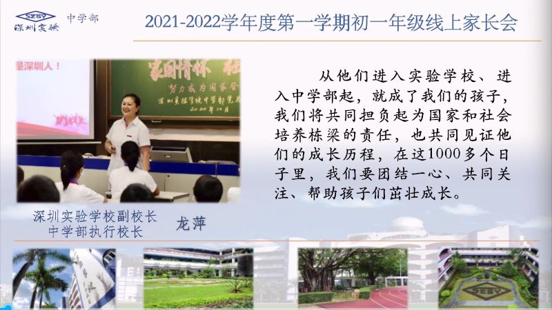【年级家长会】为实现家校共营、家校共赢,中学部初一年级开学初即召开了年级线上家长会。深圳实验学校副校长、中学部执行校长龙萍在讲话中希望家长们做好孩子的榜样,在孩子成长的过程中,帮助他们养成良好的习惯;同时要注重孩子的身心健康,关注孩子的情绪变化,必要时寻求科学的方式帮助他们。龙校长强调,学校各项教育教学工作的开展都遵循教育规律和孩子们的成长规律,希望家长尊重学校的安排,同时为学校的发展建言献策。家长会上,龙校长表态,中学部全体老师定会平等、公正地对待每一位学生,也请家长用实际行动来理解和支持老师们的工作。