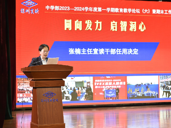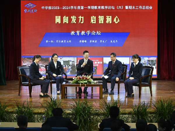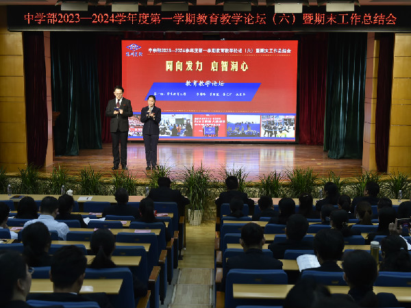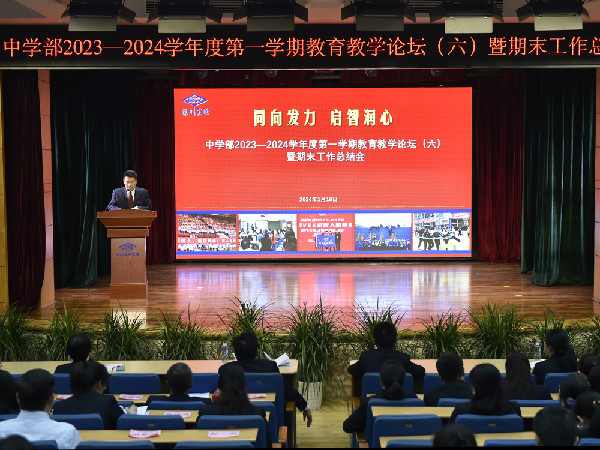 2024年1月18日下午,中学部全体教职工在小礼堂集中,召开了本学期第六次教育教学论坛暨期末工作总结会,活动主题为“同向发力,启智润心”。论坛旨在通过交流与讨论,梳理总结办学成绩,增进团队凝聚力,提升教育教学质量,促进中学部教育事业的全面发展。